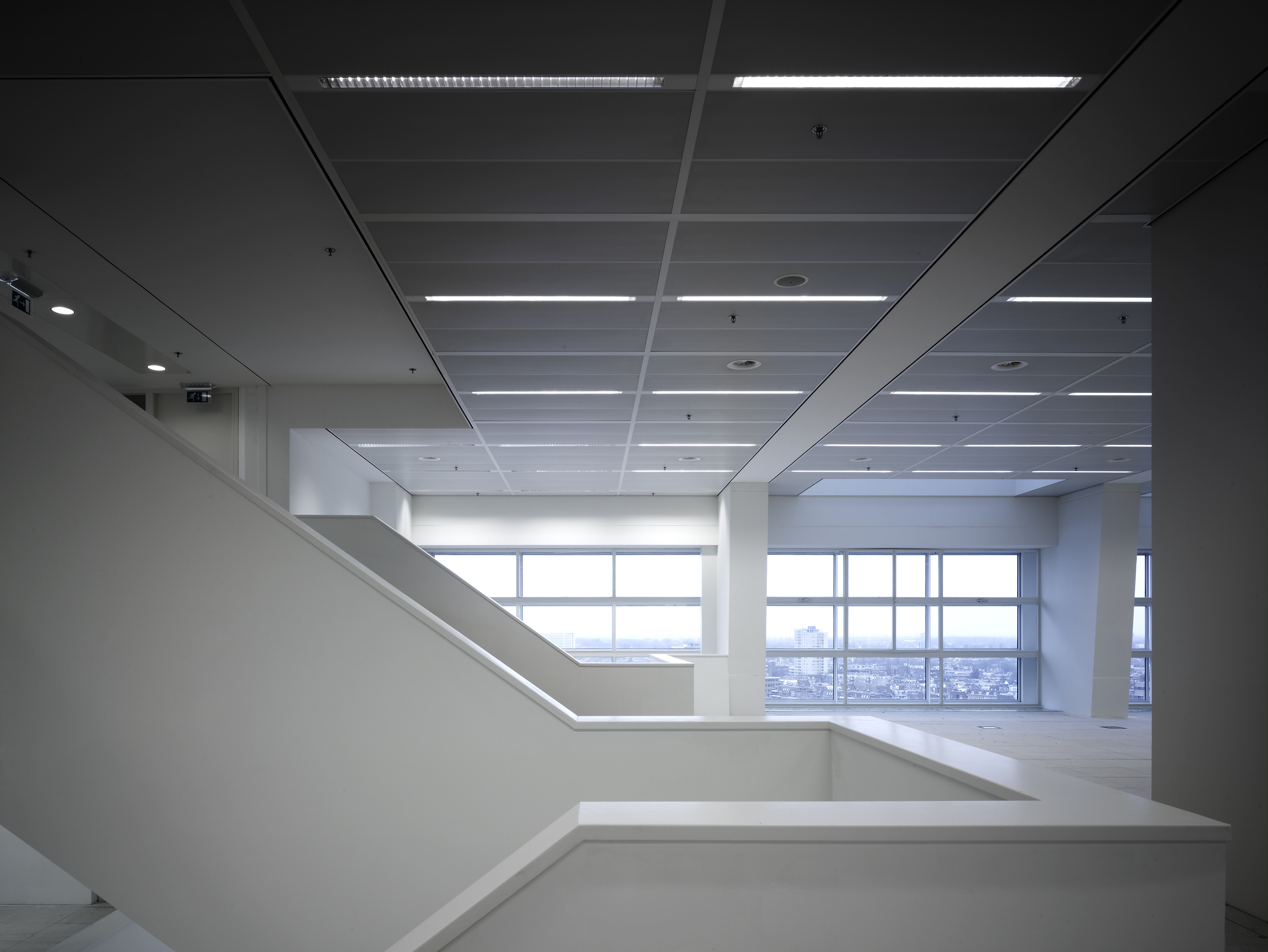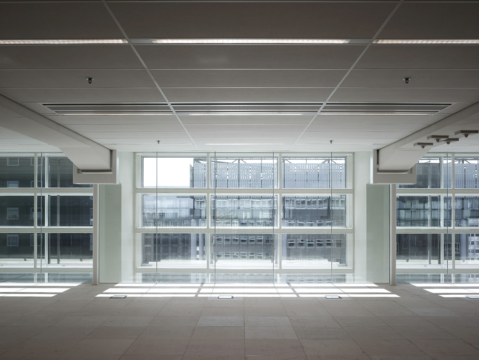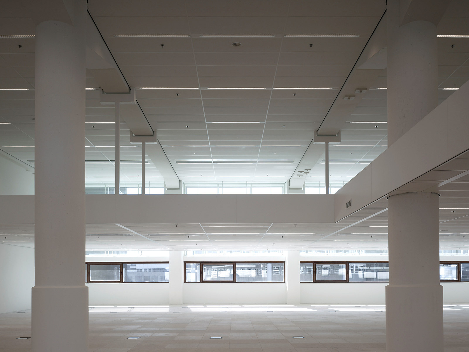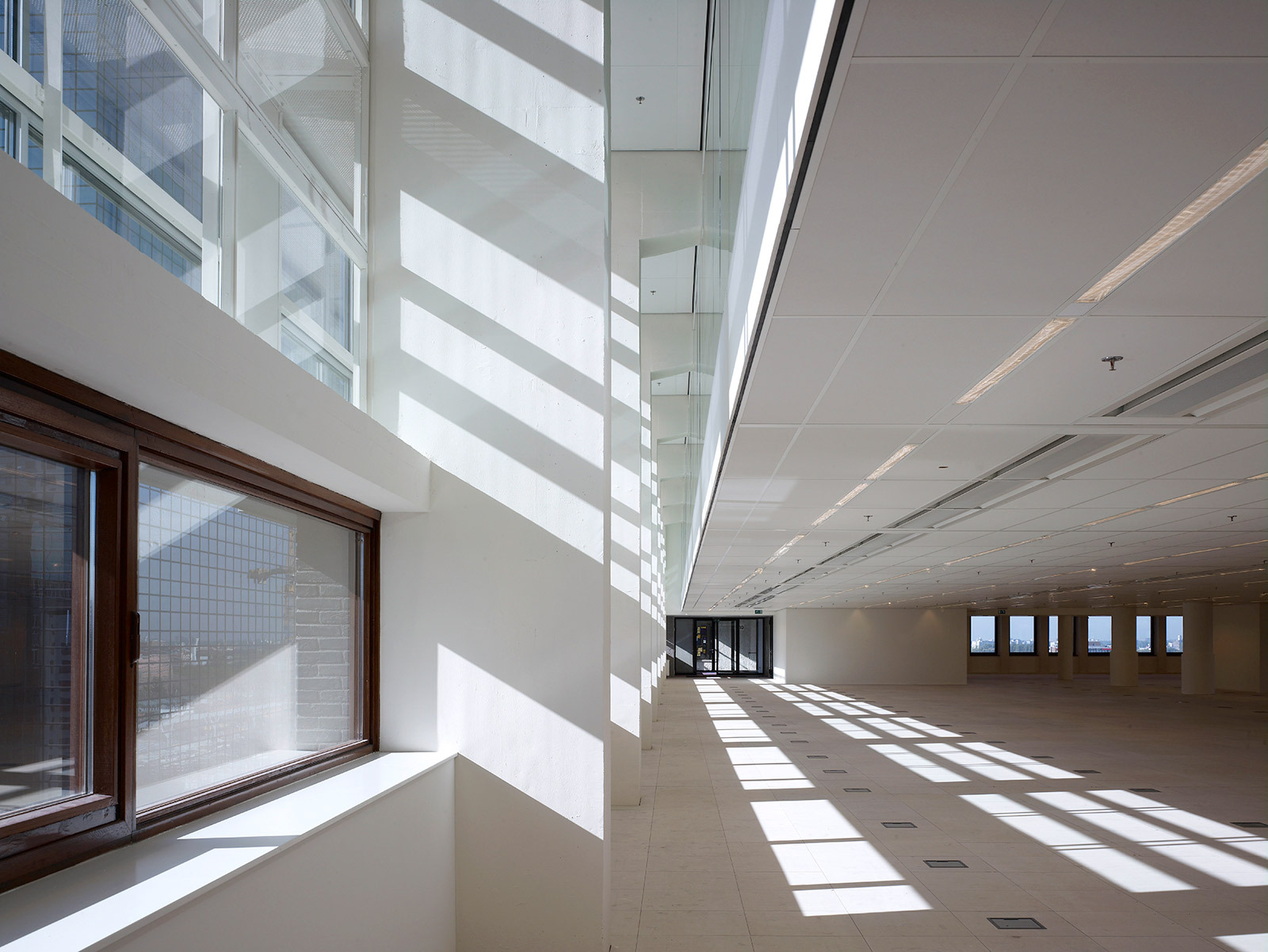 As part of the redevelopment, the existing cores on both sides of the building were updated and the long office floors were divided by a wall to reduce the size of rentable units while creating fireproof compartments. A corporate penthouse is housed on the top floor, with a terrace overlooking the city, while the ground-floor spaces add vibrancy to an updated and contemporary Delftseplein.