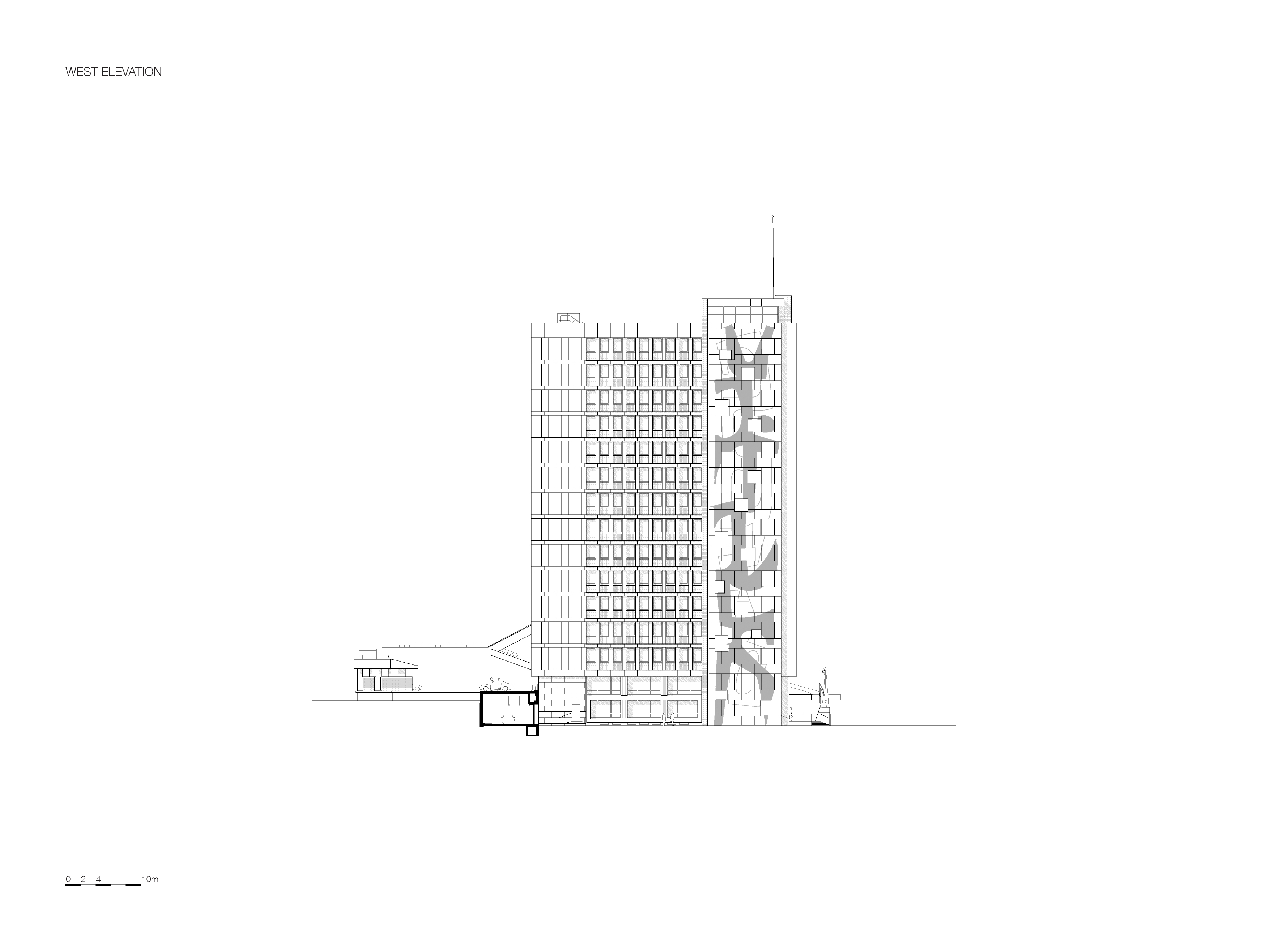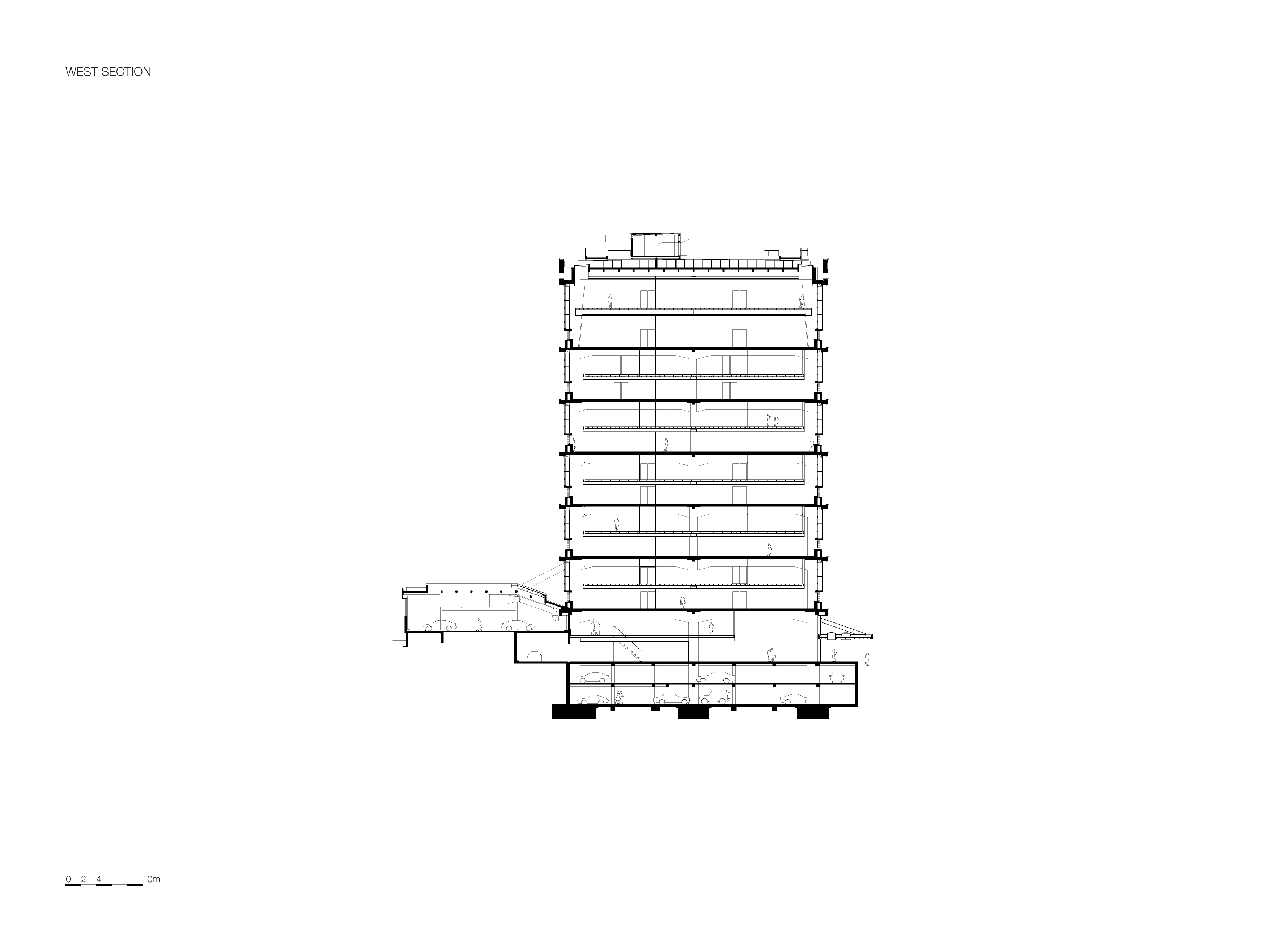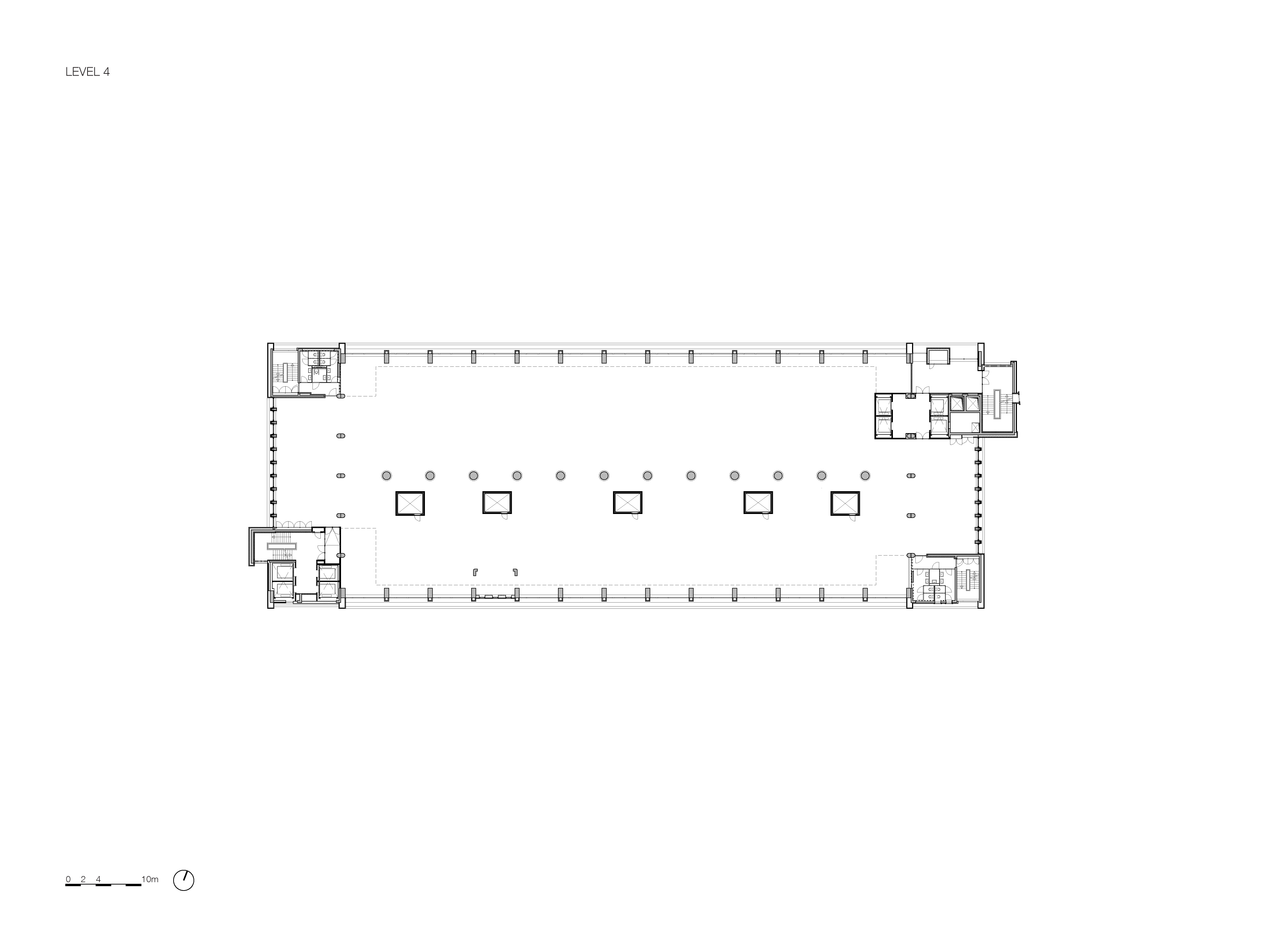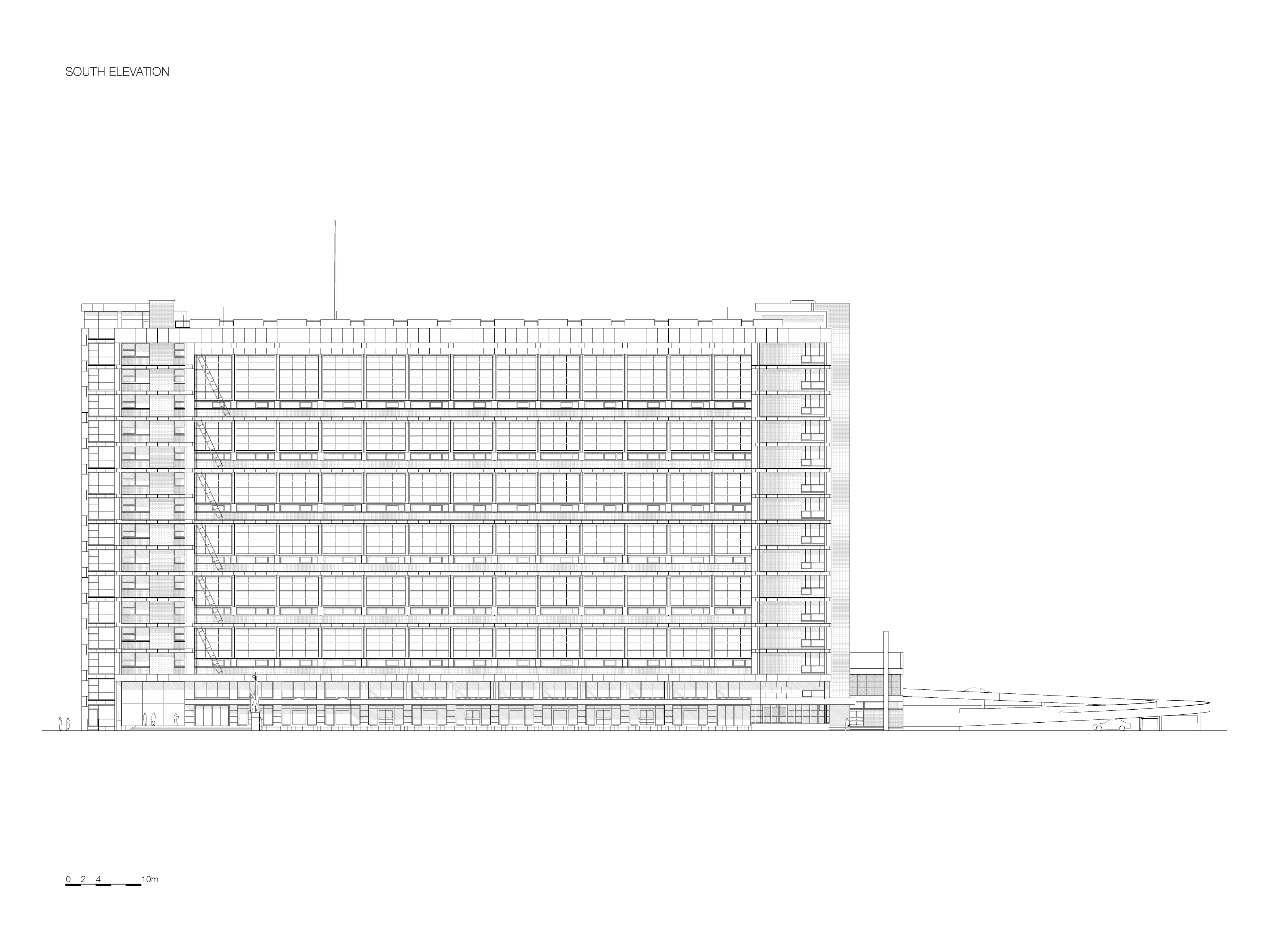 As part of the redevelopment, the existing cores on both sides of the building were updated and the long office floors were divided by a wall to reduce the size of rentable units while creating fireproof compartments. A corporate penthouse is housed on the top floor, with a terrace overlooking the city, while the ground-floor spaces add vibrancy to an updated and contemporary Delftseplein.