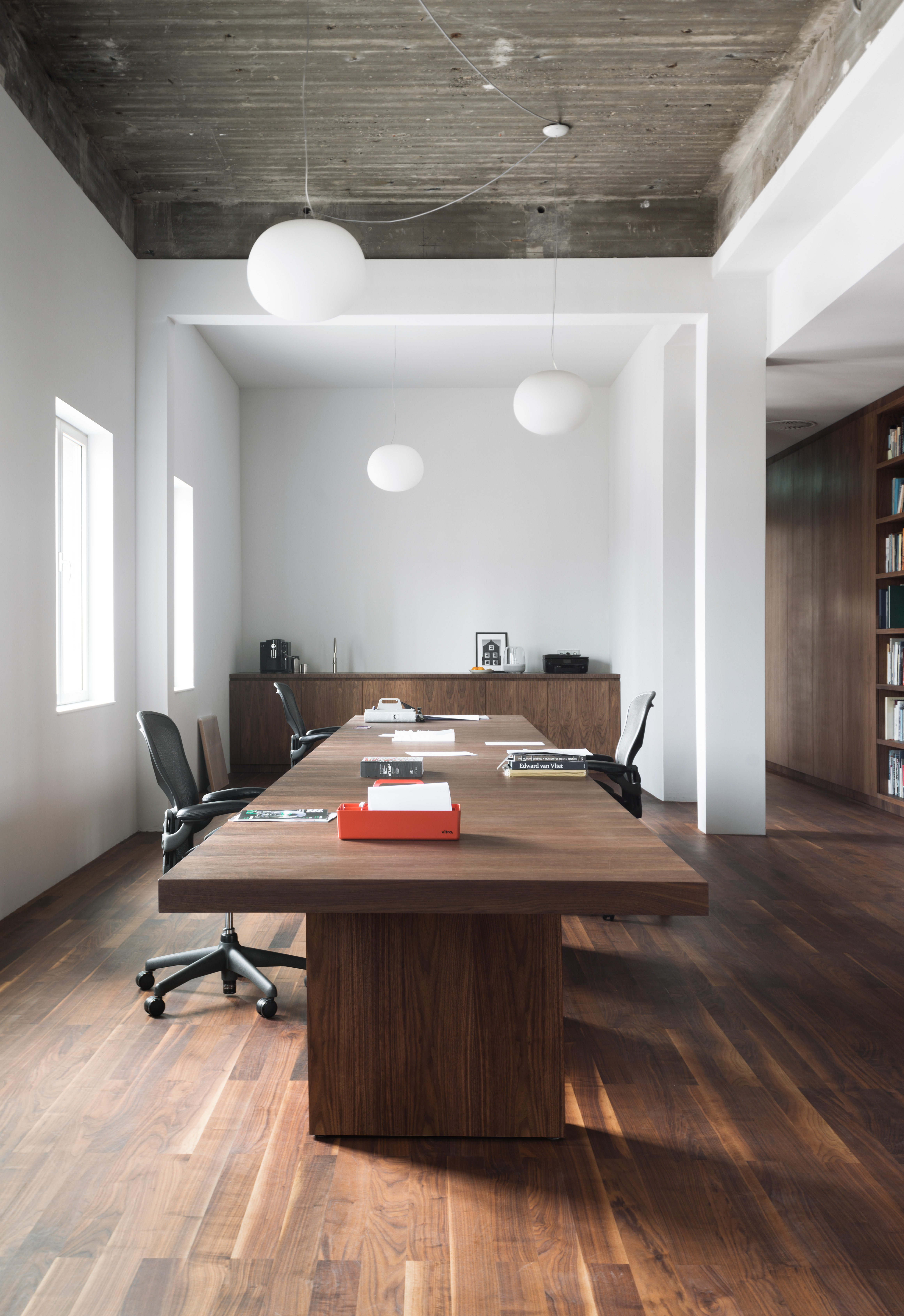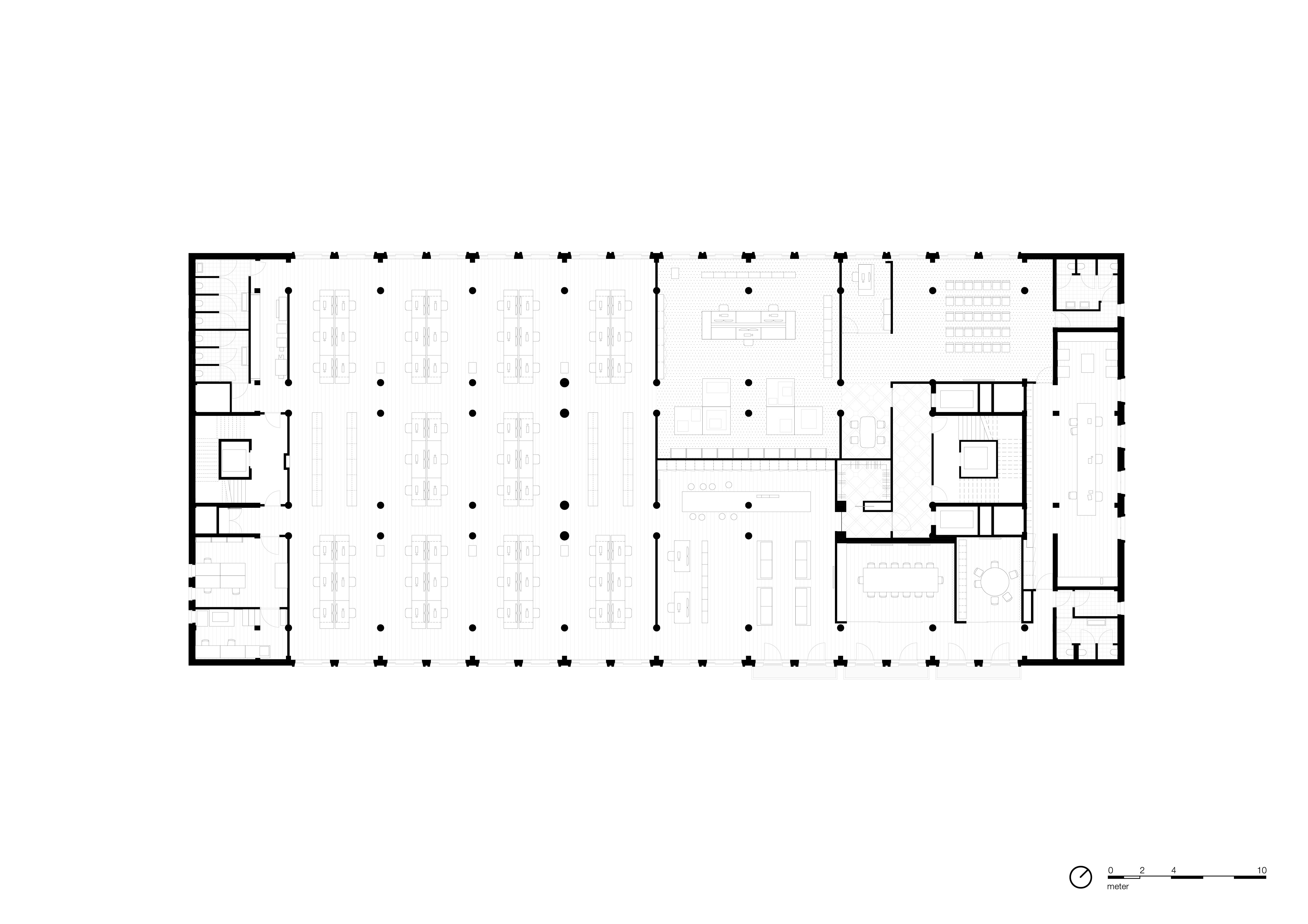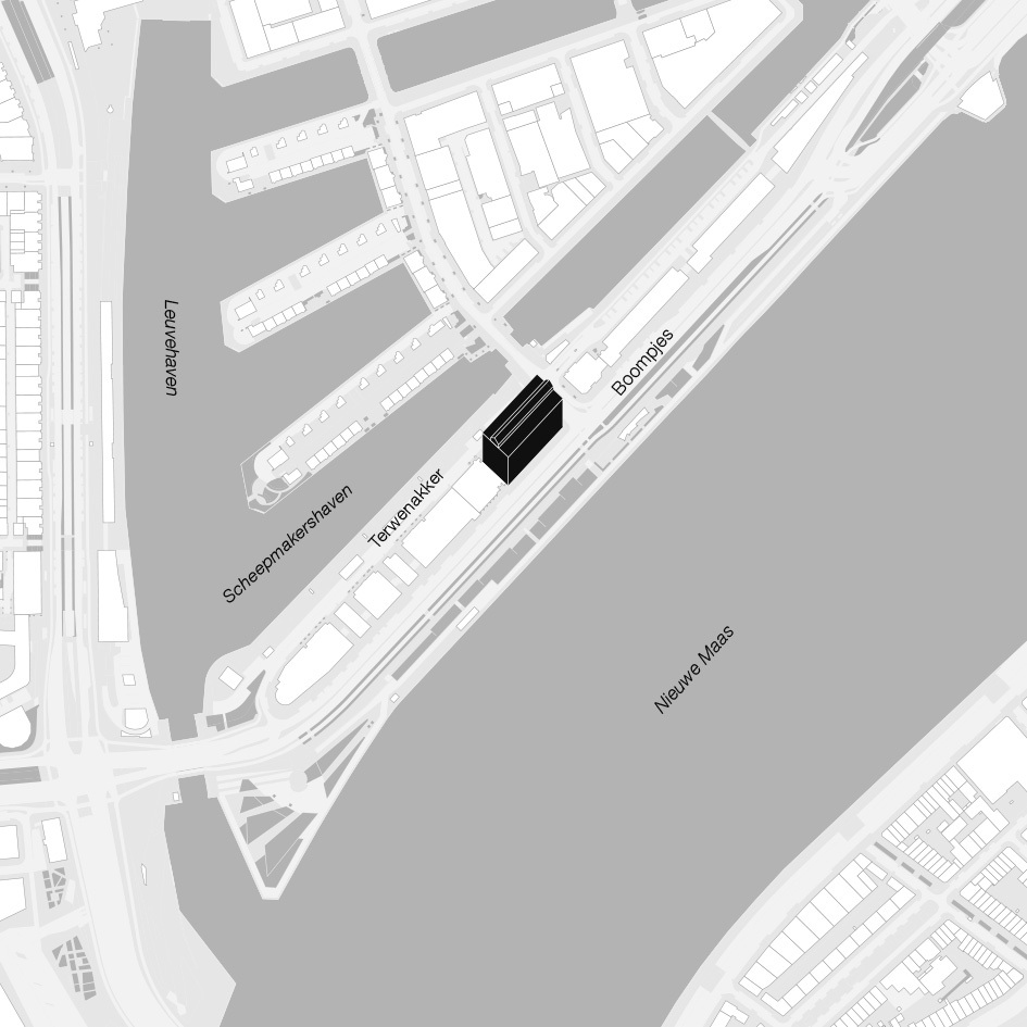 The space is on the piano nobile of a quintessential historical building originally designed by Prof. Henri Timo Zwiers in 1950-1955. The beating heart of the space is an extensive working area for architects. This space is flooded by daylight coming in from both sides and offers a unique view of the surrounding waterfront. The rectangular floor plan, with its clear proportions, is designed to effectively connect working, meeting, and leisure spaces through several long monumental corridors and passages, enhancing fluid interactions between employees, visitors, and partners.