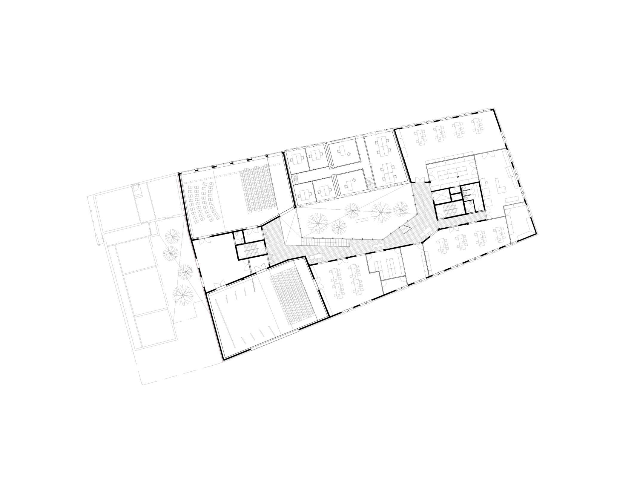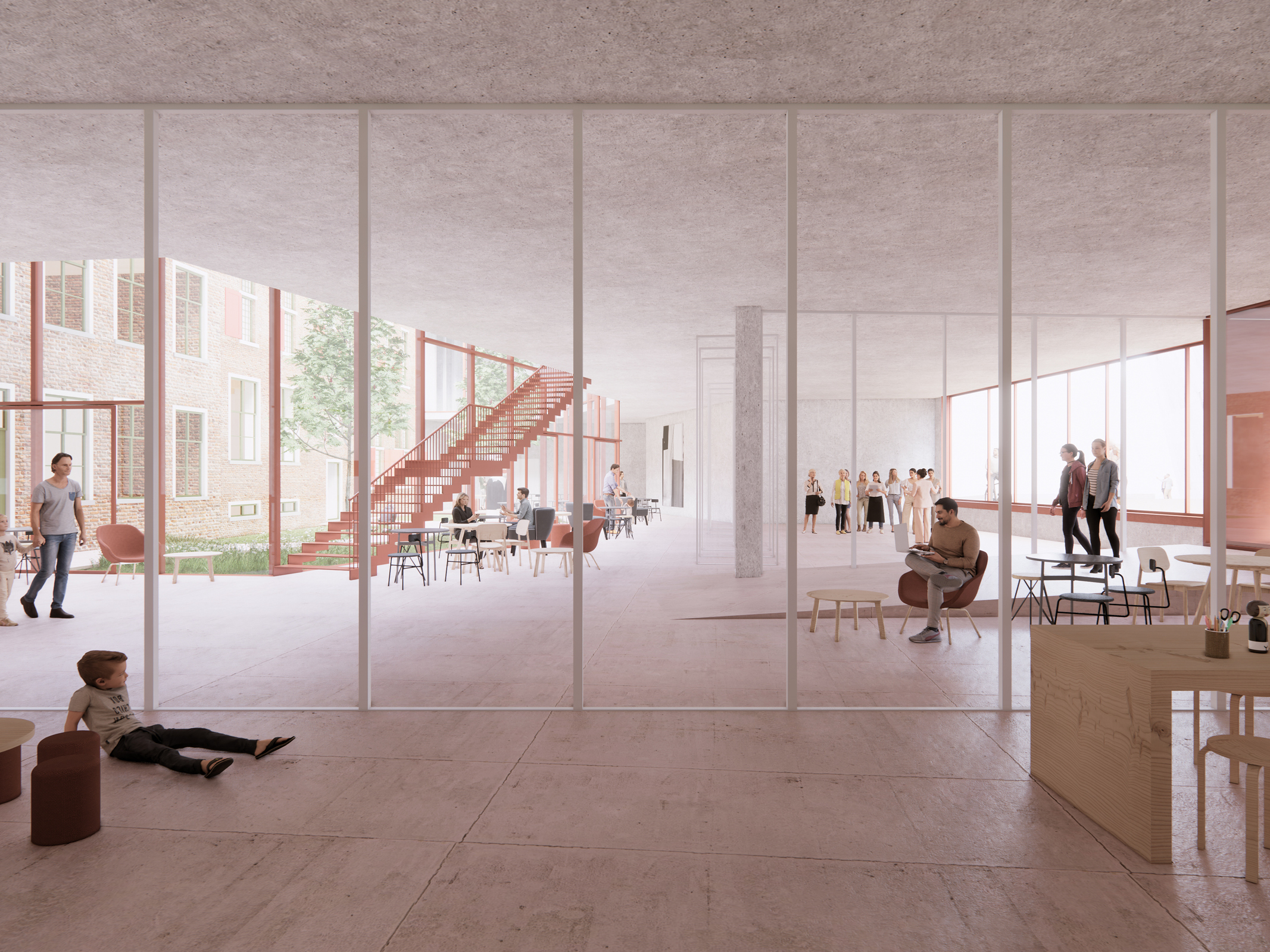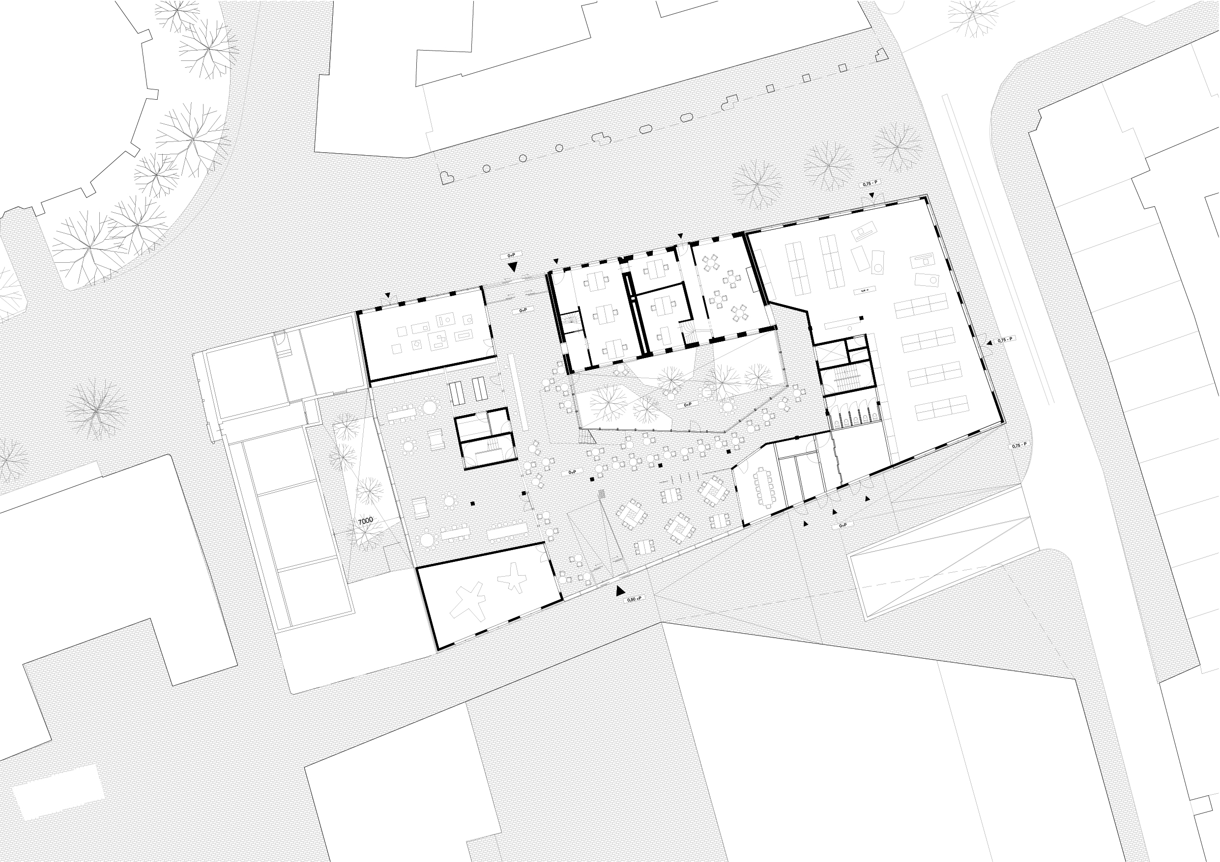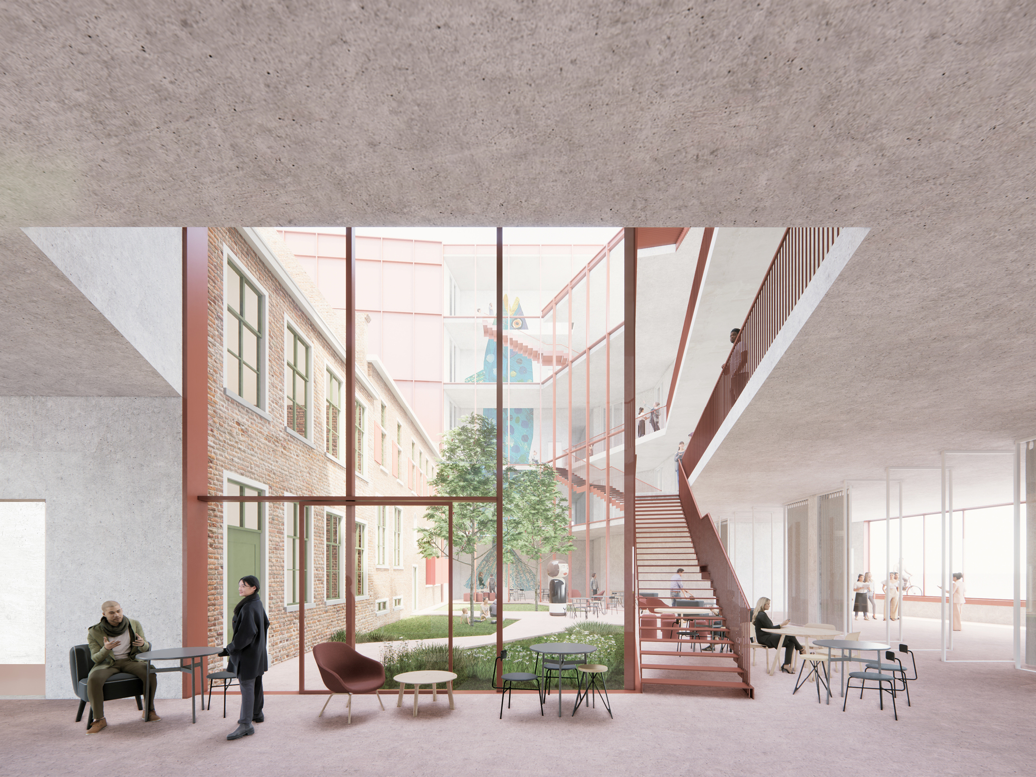 The project creates a ‘twist’ in the traditional brick architecture: through large openings in the facade, the city can view all the creative activities within. Behind the modest and rational facade, the entire ground floor opens up and provides a clear route to the Forum. At the same time, it creates a more intimate atmosphere that embraces the inner garden and the historical monuments. This inner patio connects to the Vrijdag offices, while the garden and the monumental facade also form a memorable and relaxing backdrop for the Living Room. From the ground floor, one can move around the entire building via a series of open staircases with a clear view of each floor’s activities. Due to the irregular shape of the patio, the otherwise monotonous corridors are divided into several triangular meeting areas, creating spaces for encounters and creativity.