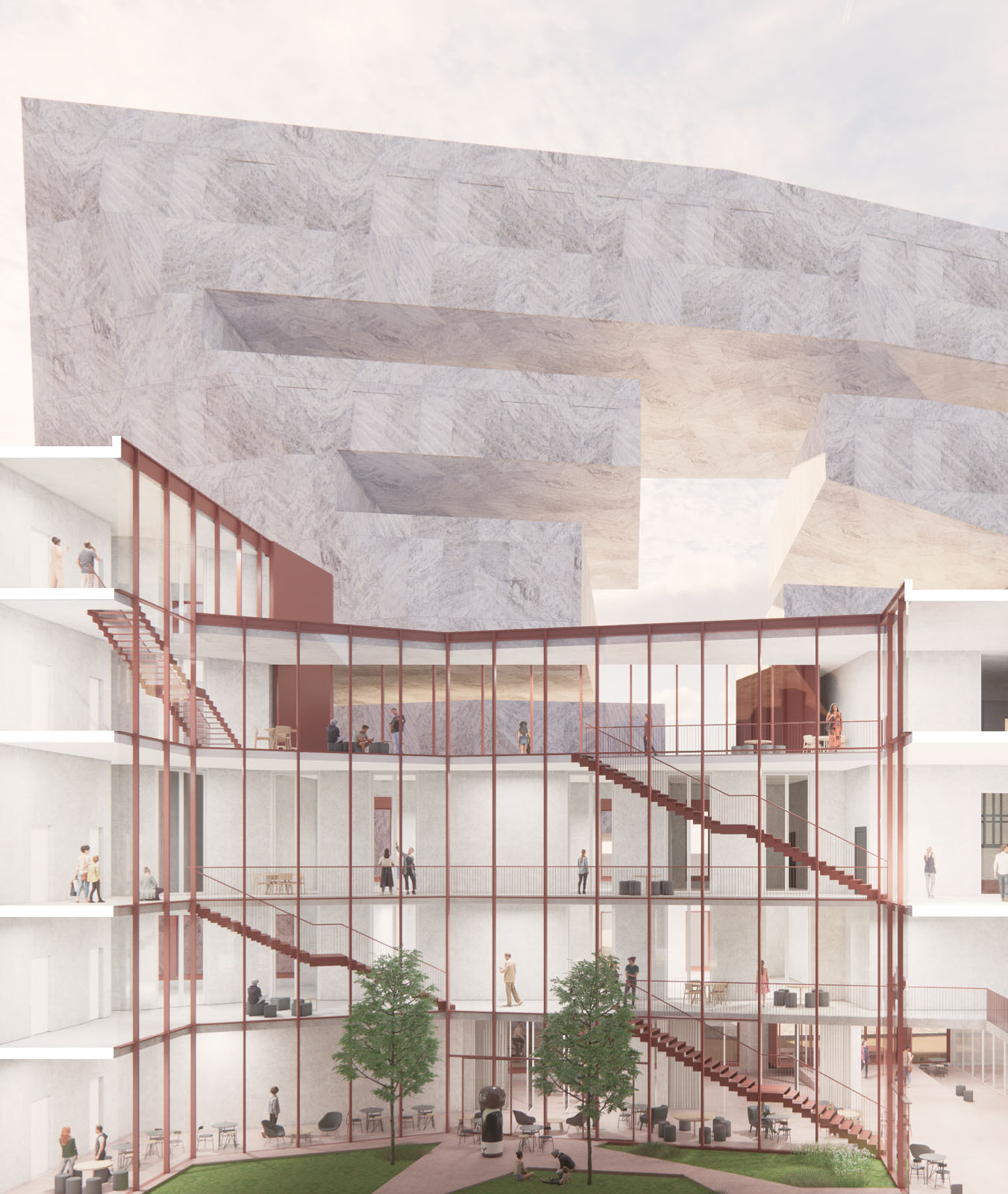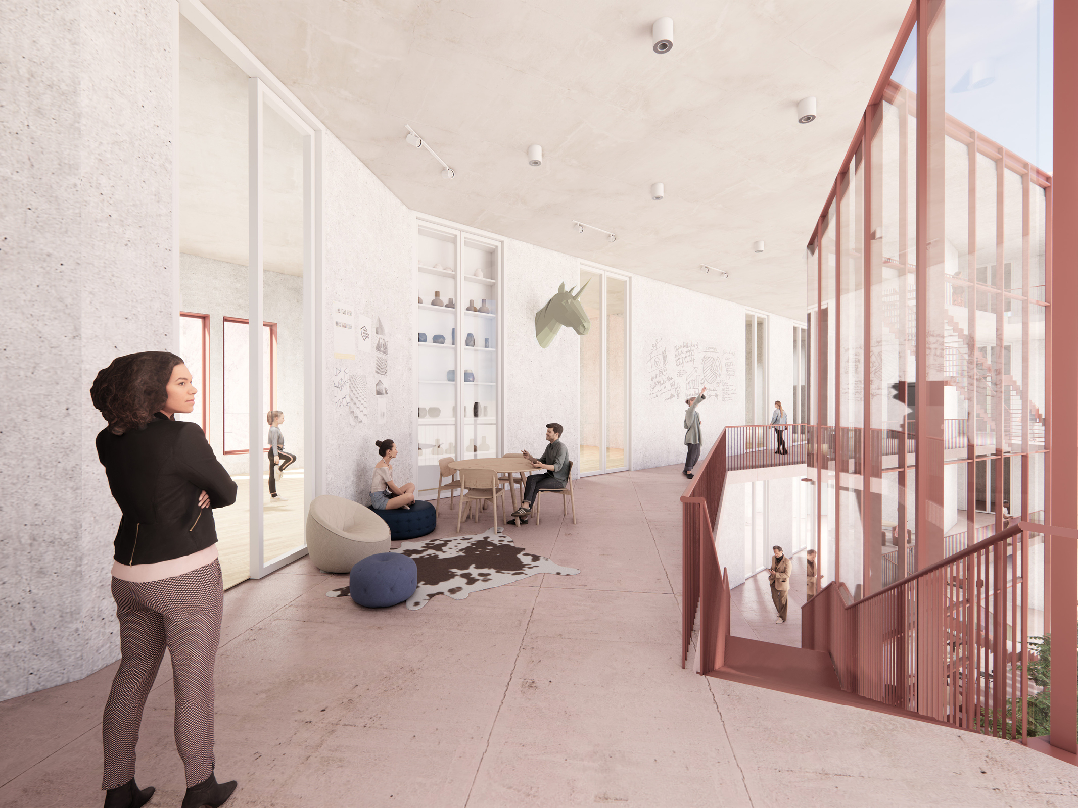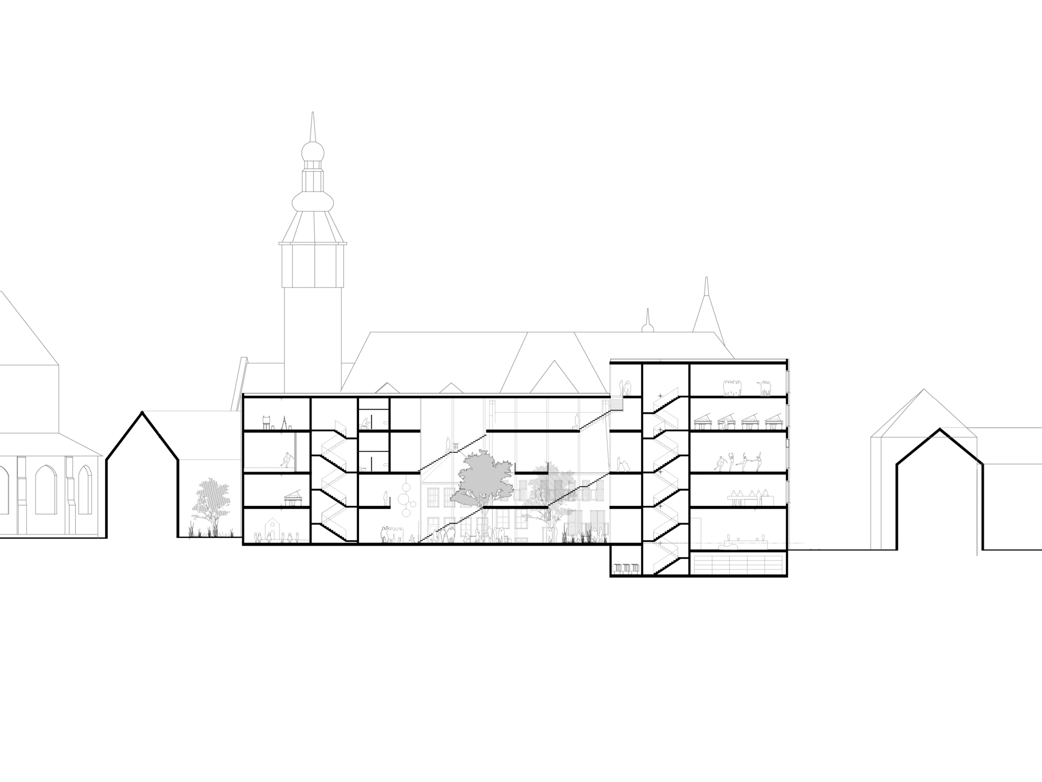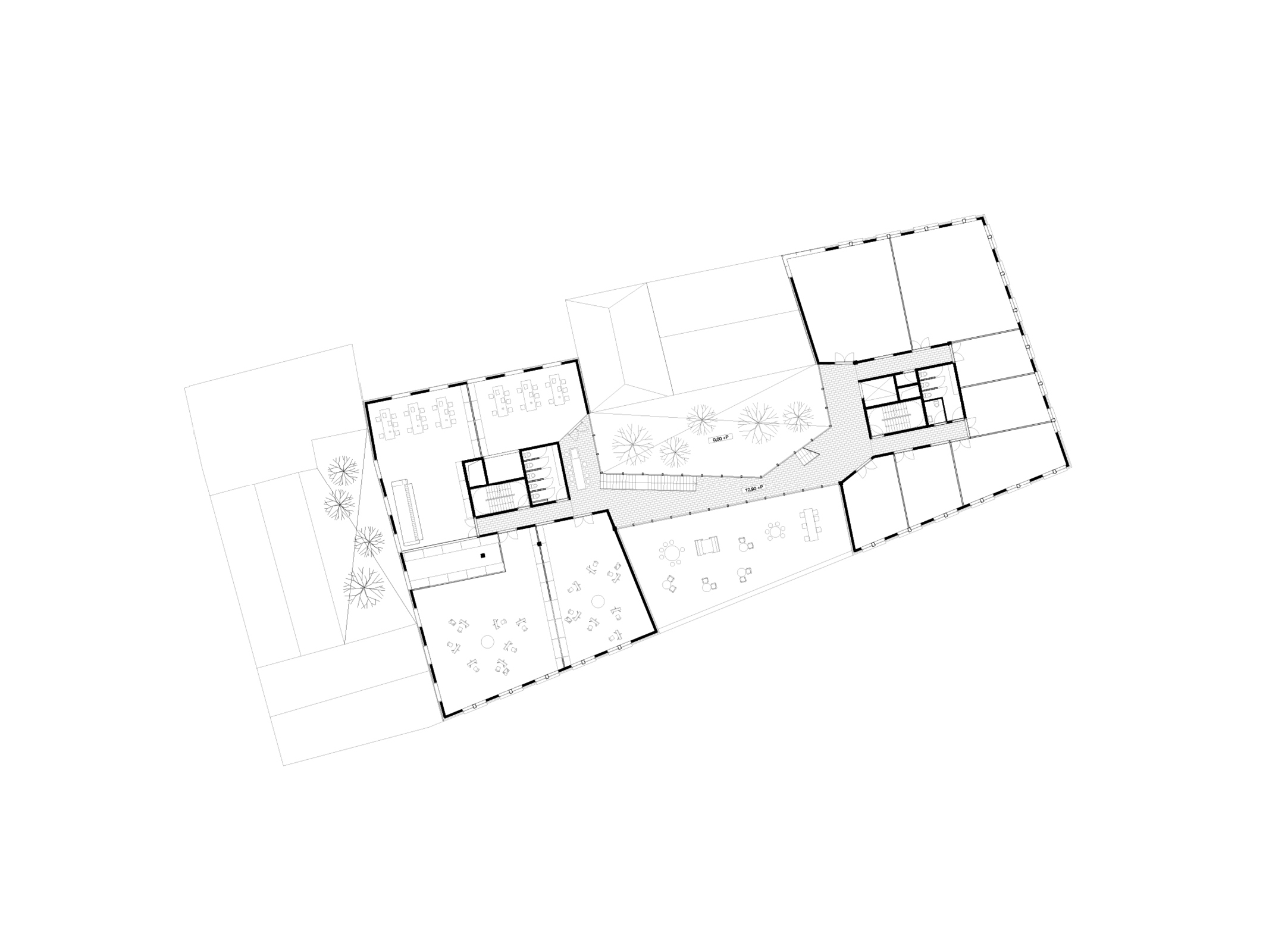 The project creates a ‘twist’ in the traditional brick architecture: through large openings in the facade, the city can view all the creative activities within. Behind the modest and rational facade, the entire ground floor opens up and provides a clear route to the Forum. At the same time, it creates a more intimate atmosphere that embraces the inner garden and the historical monuments. This inner patio connects to the Vrijdag offices, while the garden and the monumental facade also form a memorable and relaxing backdrop for the Living Room. From the ground floor, one can move around the entire building via a series of open staircases with a clear view of each floor’s activities. Due to the irregular shape of the patio, the otherwise monotonous corridors are divided into several triangular meeting areas, creating spaces for encounters and creativity.