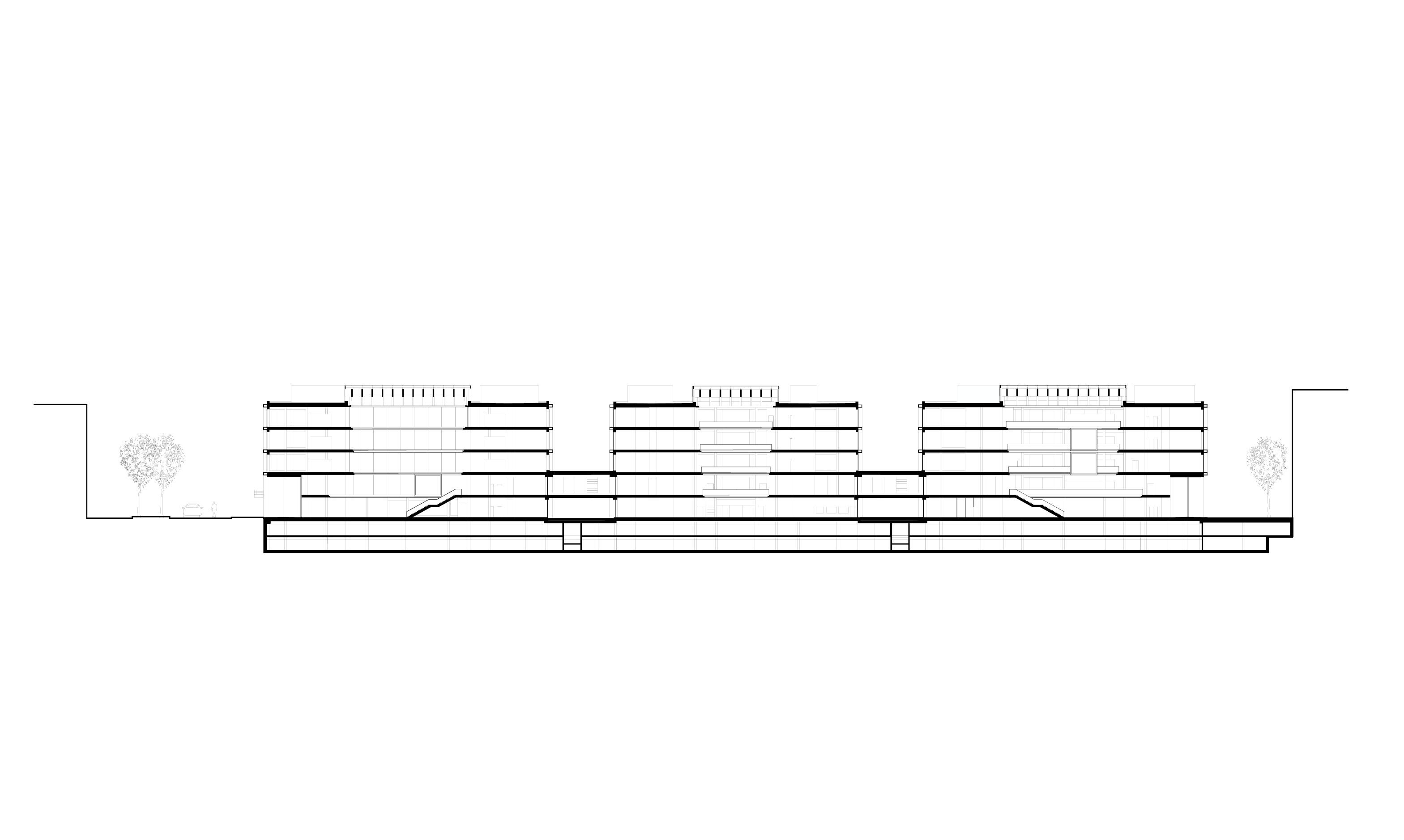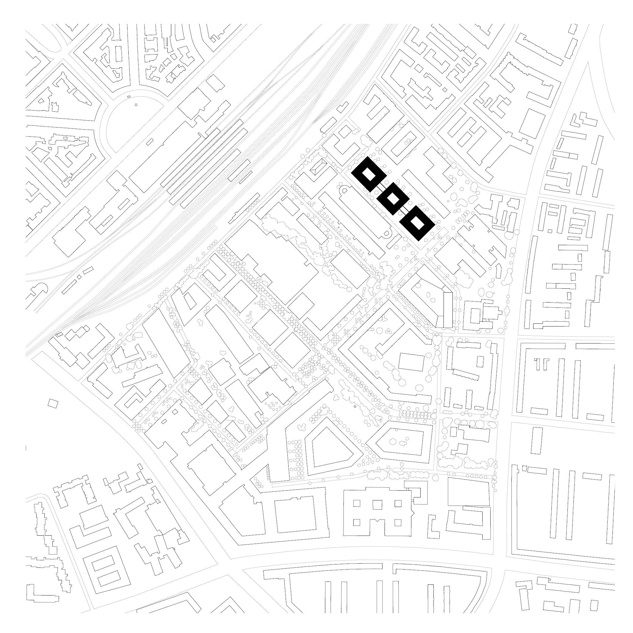 Located in the former industrial and commercial Werksviertel district of Munich, the three iCampus buildings bring a novel office typology to the area: loft-like workspaces fit for contemporary creatives. The flexible internal dynamics of the building are visible through the generous openings on the modular façade. The rational grid consists of over 800 large prefab concrete elements, while dark metal cladding wraps the entrances, stairways, and technical spaces in a continuous skin.