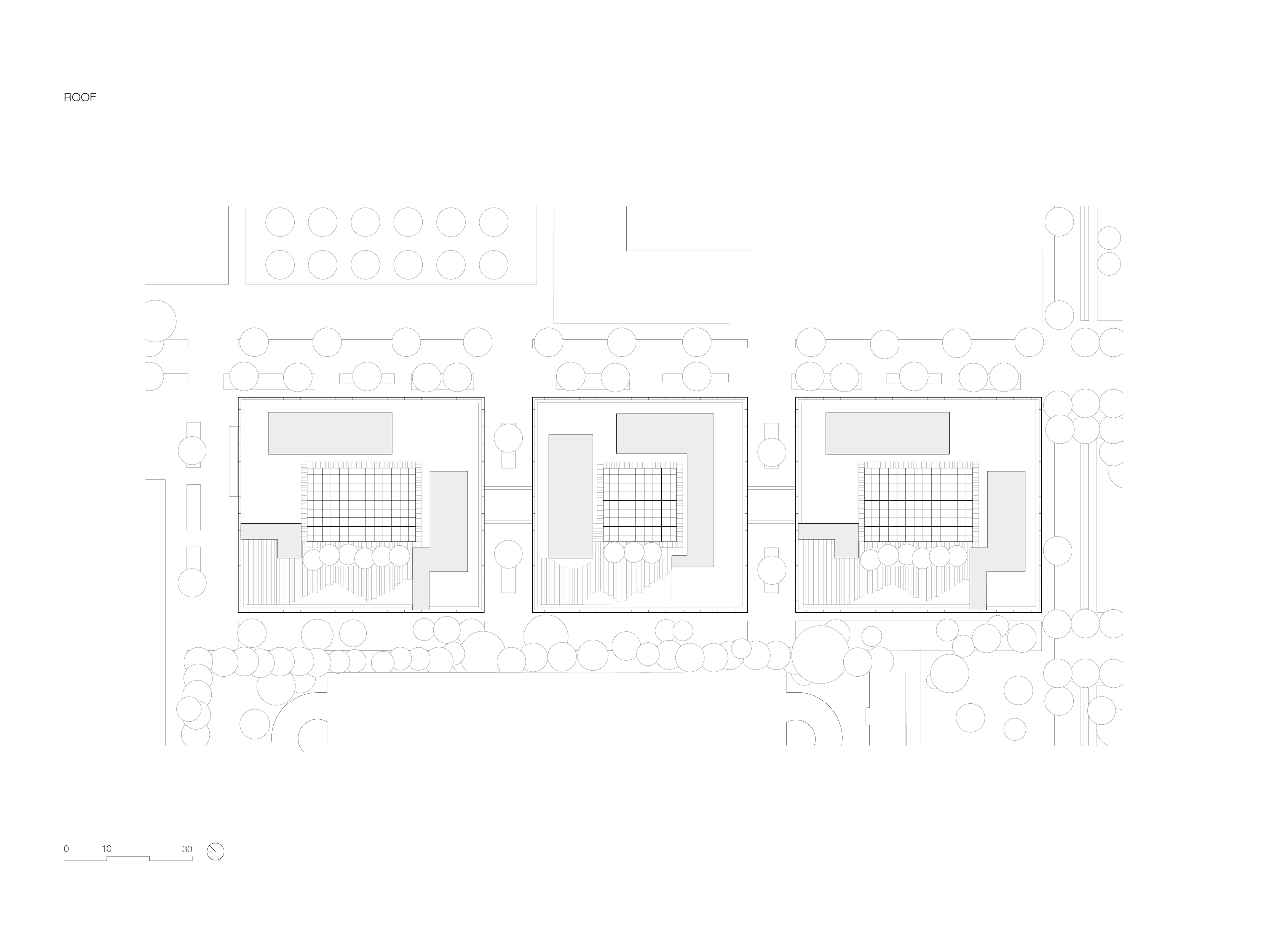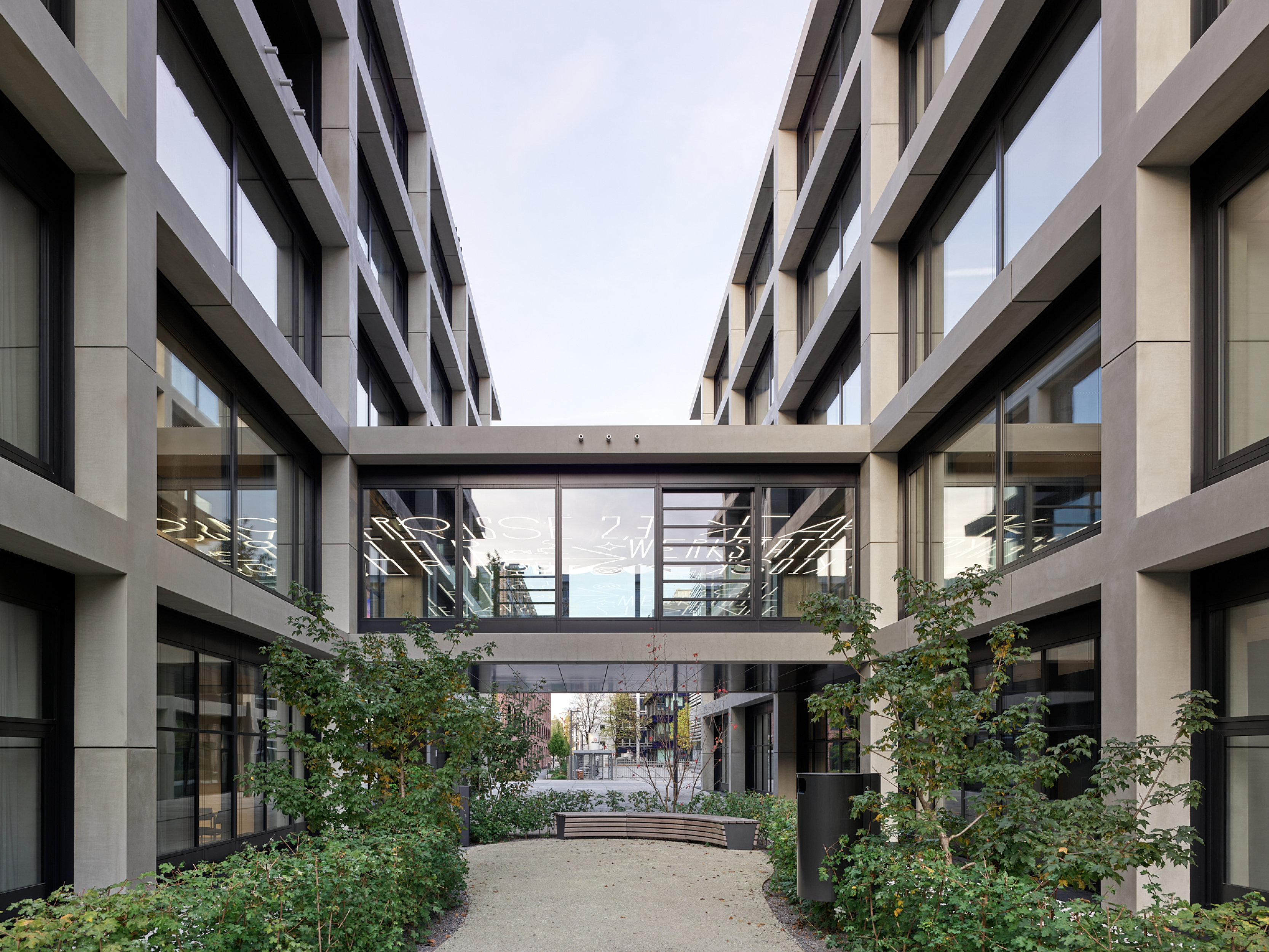 All the floors come together around large central atriums, which embody the social heart of the complex. Elegant ‘lanterns’ made of laminated timber beams crown the atriums, providing plenty of daylight and preventing heat accumulation. The buildings give way to green rooftop terraces for all tenants and provide views of the nearby Alps. Rooted in the rational appearance of the site’s industrial heritage, with generously proportioned openings and a high level of refinement, the iCampus ensemble blends with the existing urban fabric, offering a comfortable and future-proof work environment.