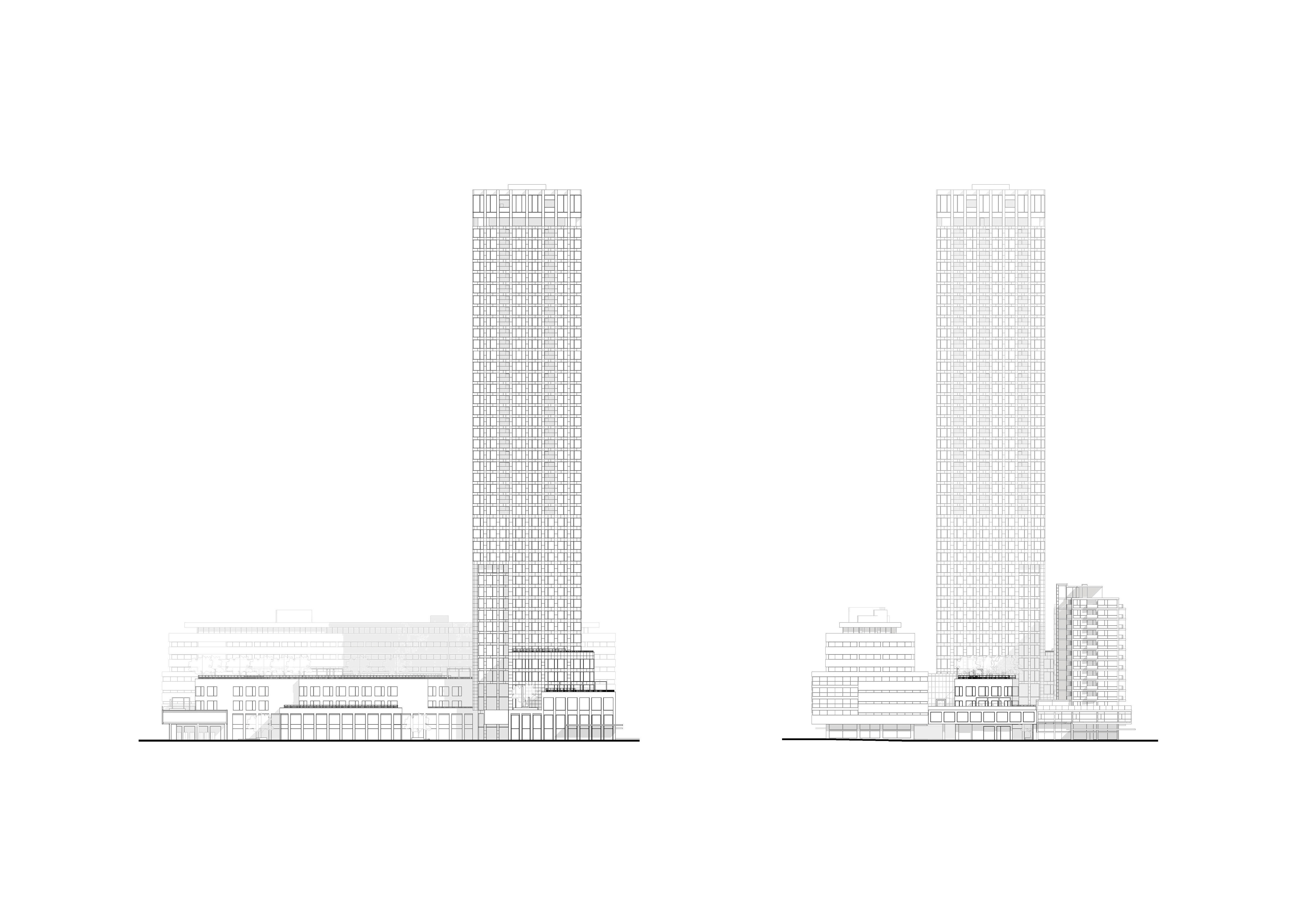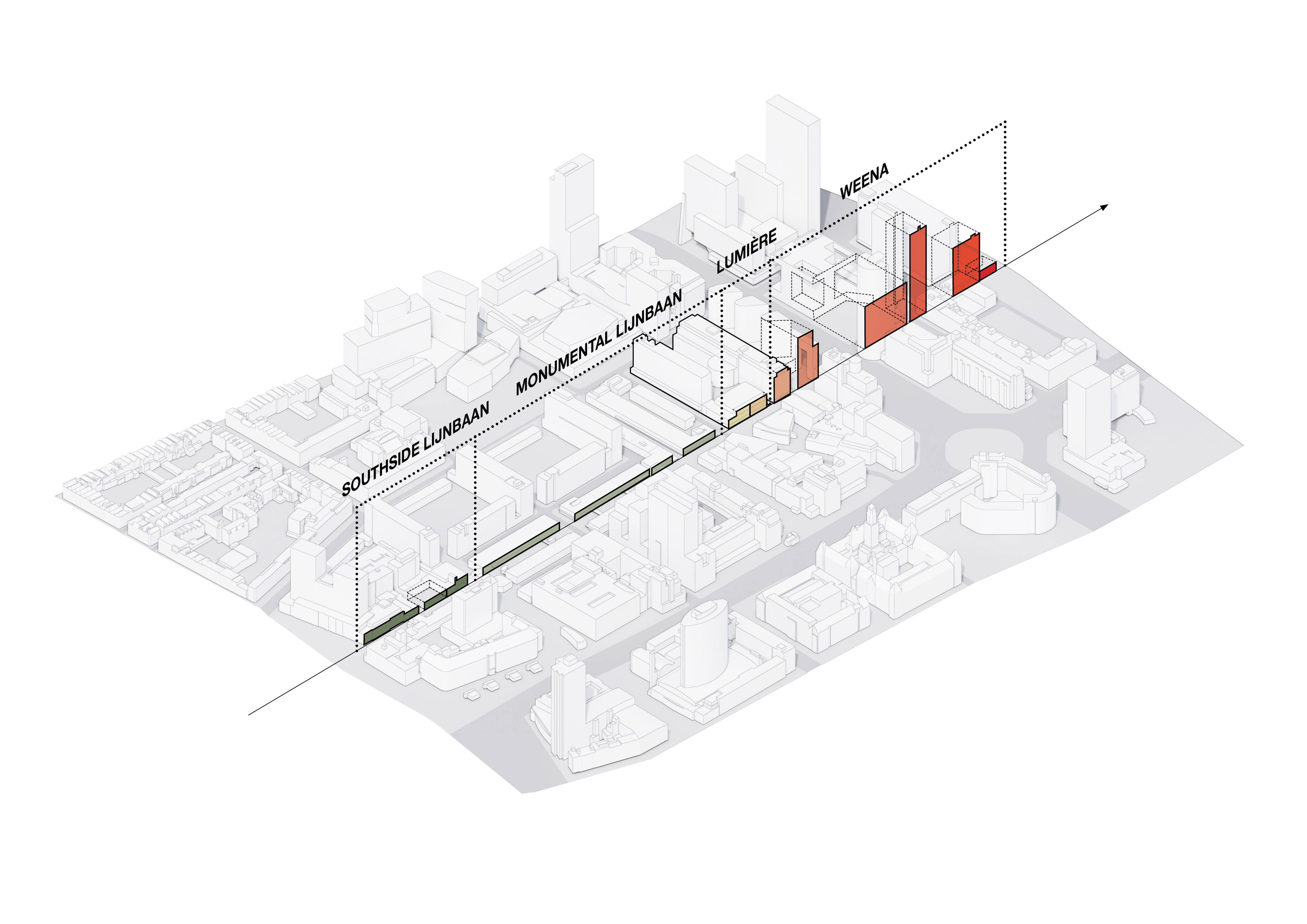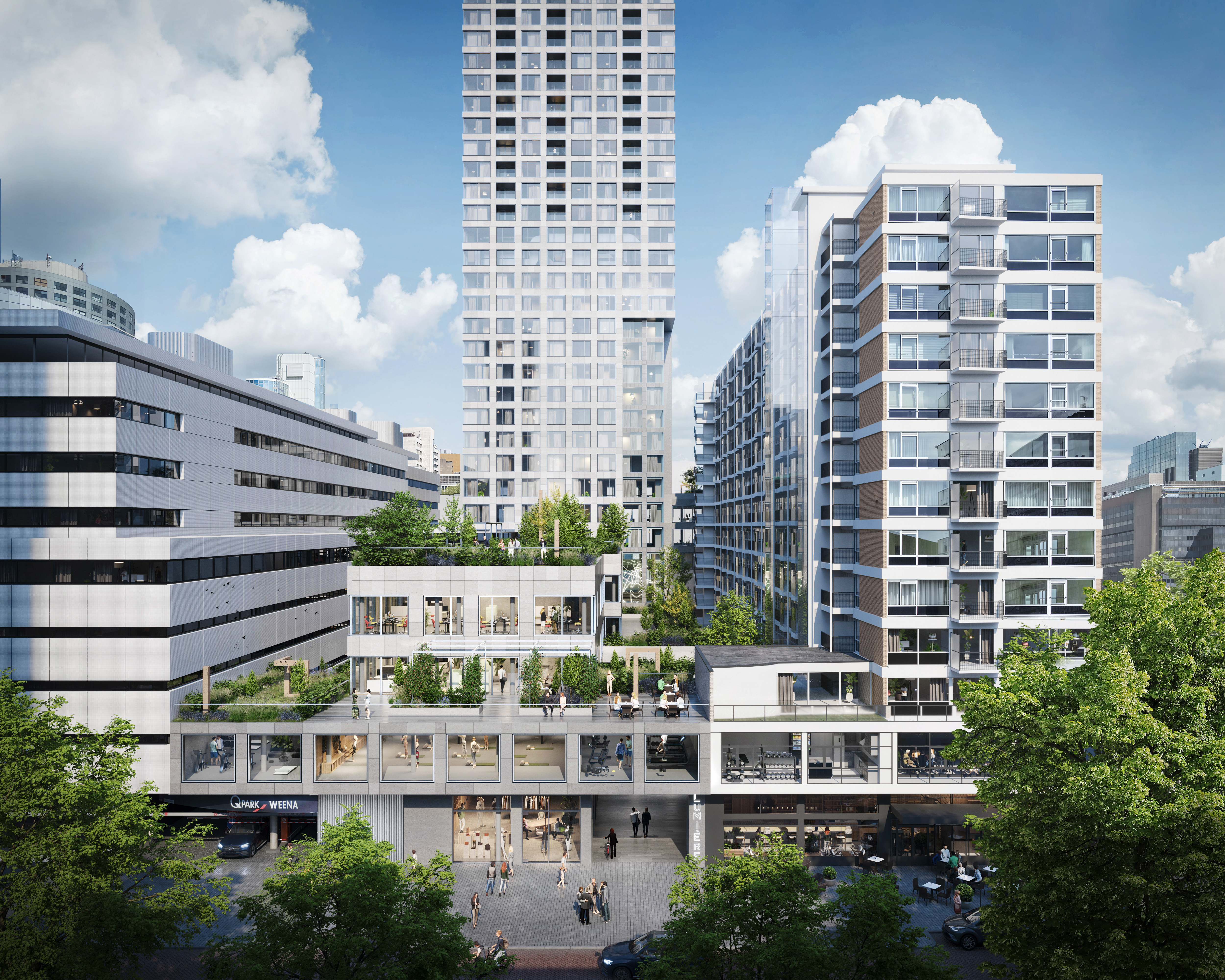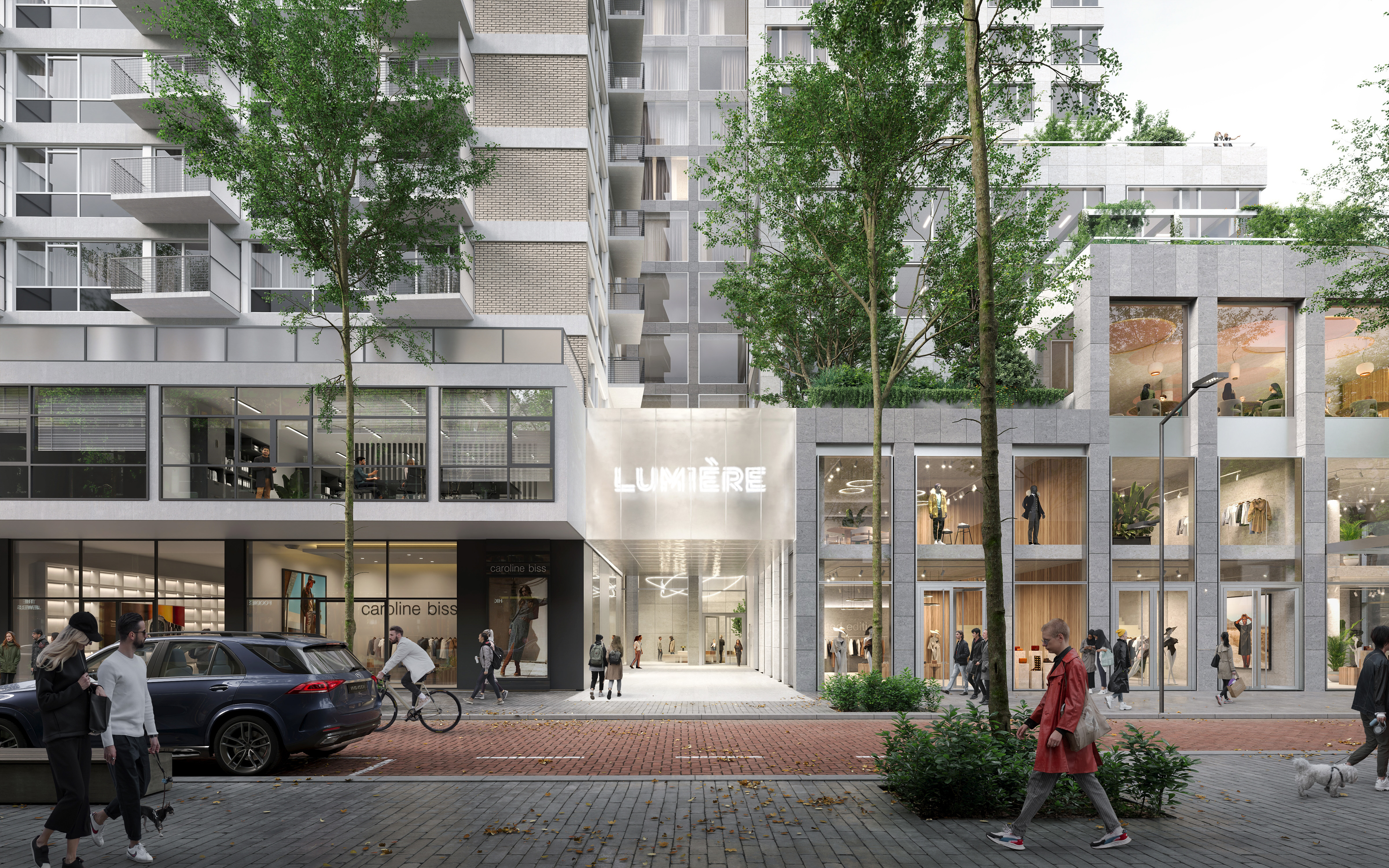 Lumière is an ambitious plan for a 155m tower with a publicly connected and locally integrated plinth. Positioned between the Lijnbaan, Kruiskade, and Karel Doormanstraat, the plinth spreads out to connect with its surroundings, becoming a semi-public city block while keeping the monumental buildings of the Lijnbaan ensemble intact. After slight setbacks in the volume, the tower rises from the base. The sleek natural stone facade increases in transparency towards the top and includes loggias for all apartments. A majestic crown contains penthouses and shared spaces for residents, such as a common living room and winter garden.