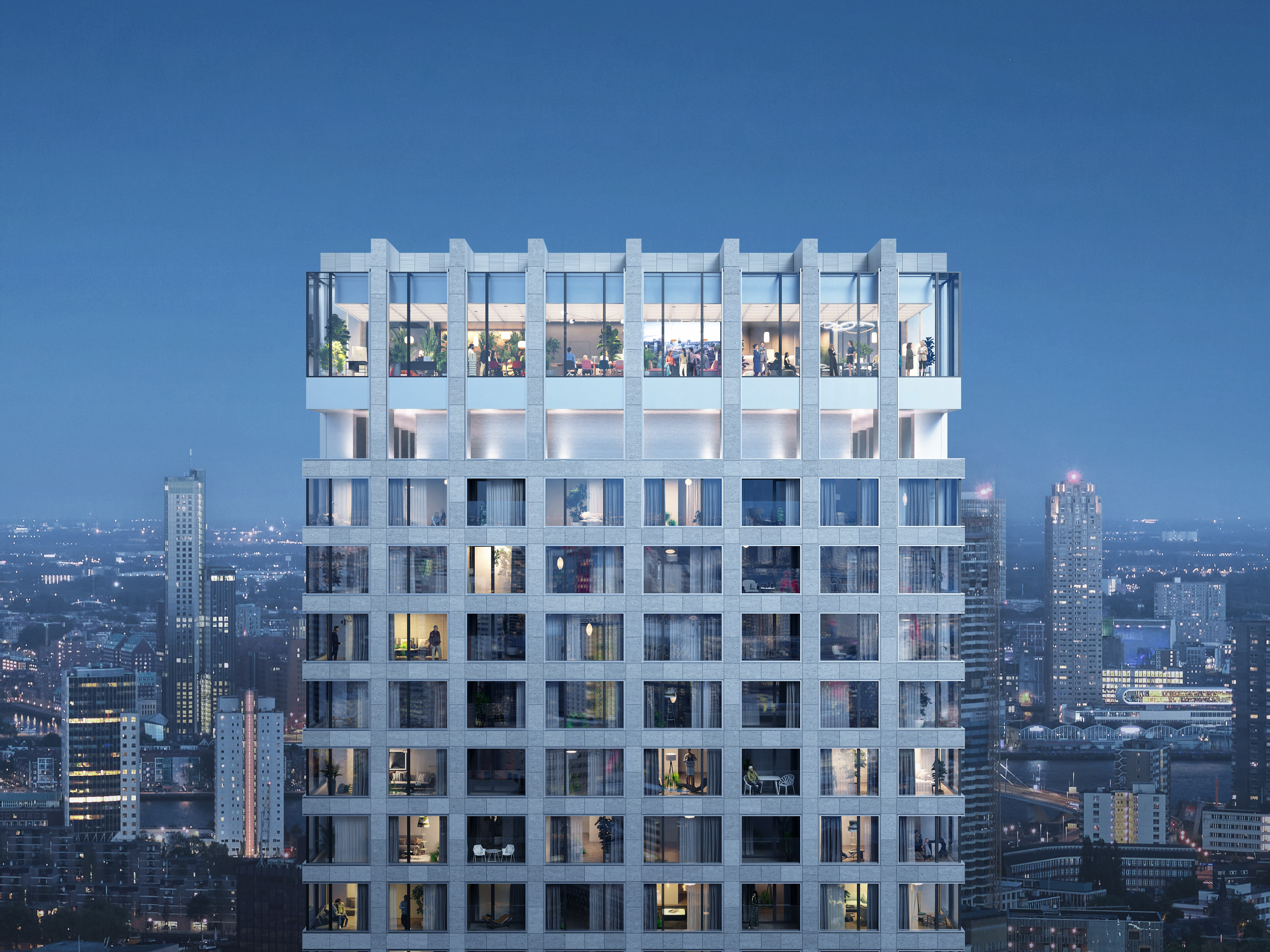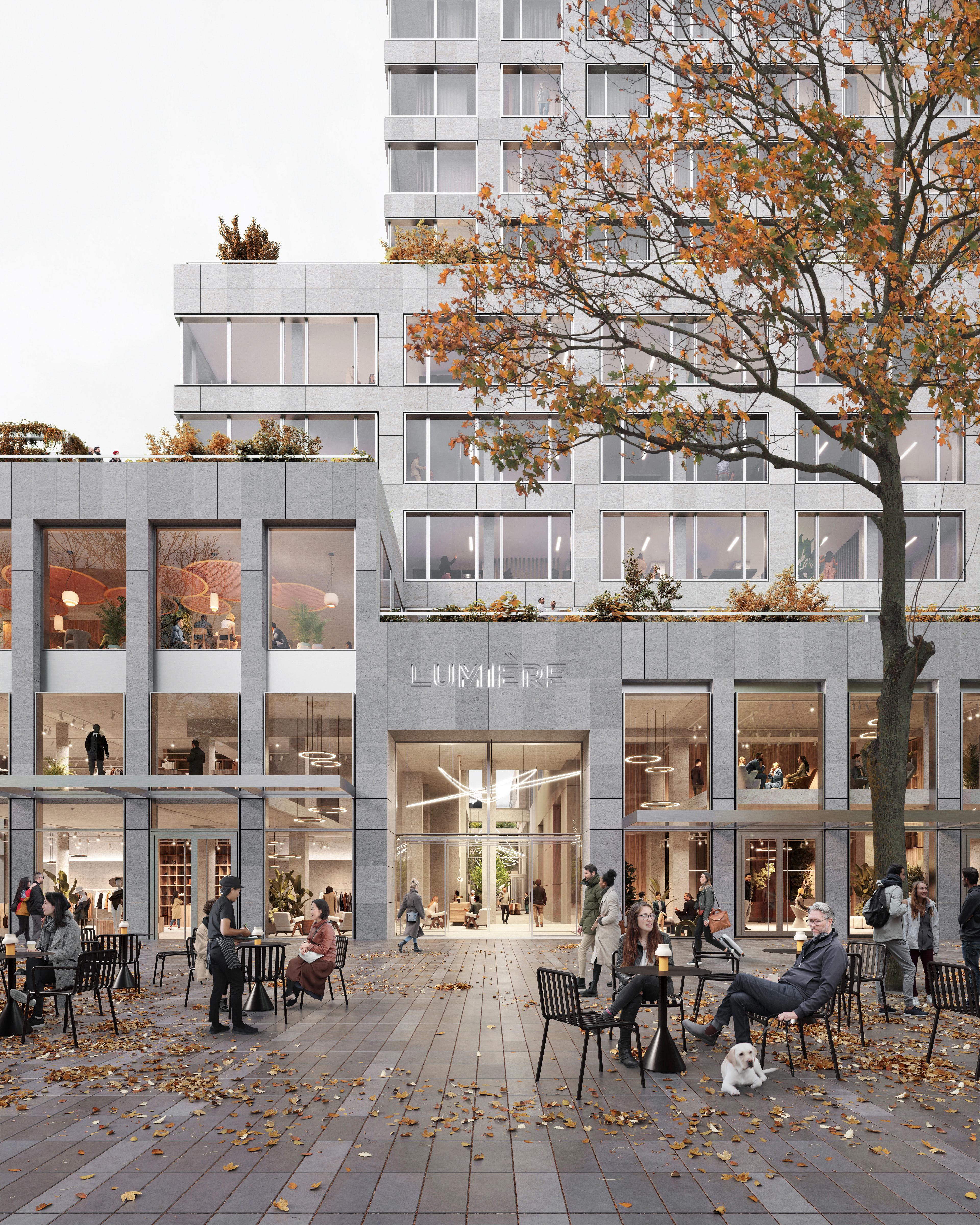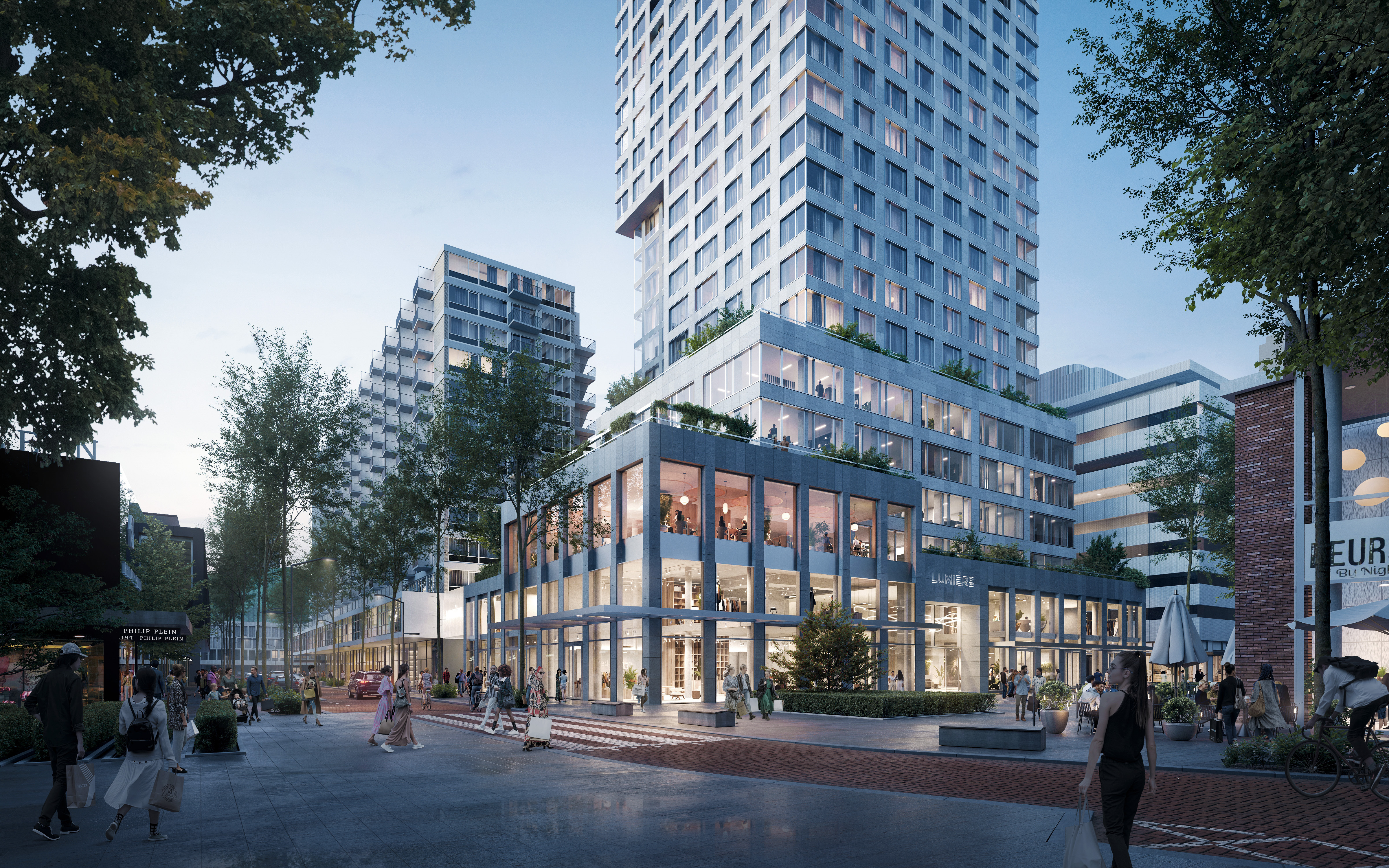 Lumière is an ambitious plan for a 155m tower with a publicly connected and locally integrated plinth. Positioned between the Lijnbaan, Kruiskade, and Karel Doormanstraat, the plinth spreads out to connect with its surroundings, becoming a semi-public city block while keeping the monumental buildings of the Lijnbaan ensemble intact. After slight setbacks in the volume, the tower rises from the base. The sleek natural stone facade increases in transparency towards the top and includes loggias for all apartments. A majestic crown contains penthouses and shared spaces for residents, such as a common living room and winter garden.