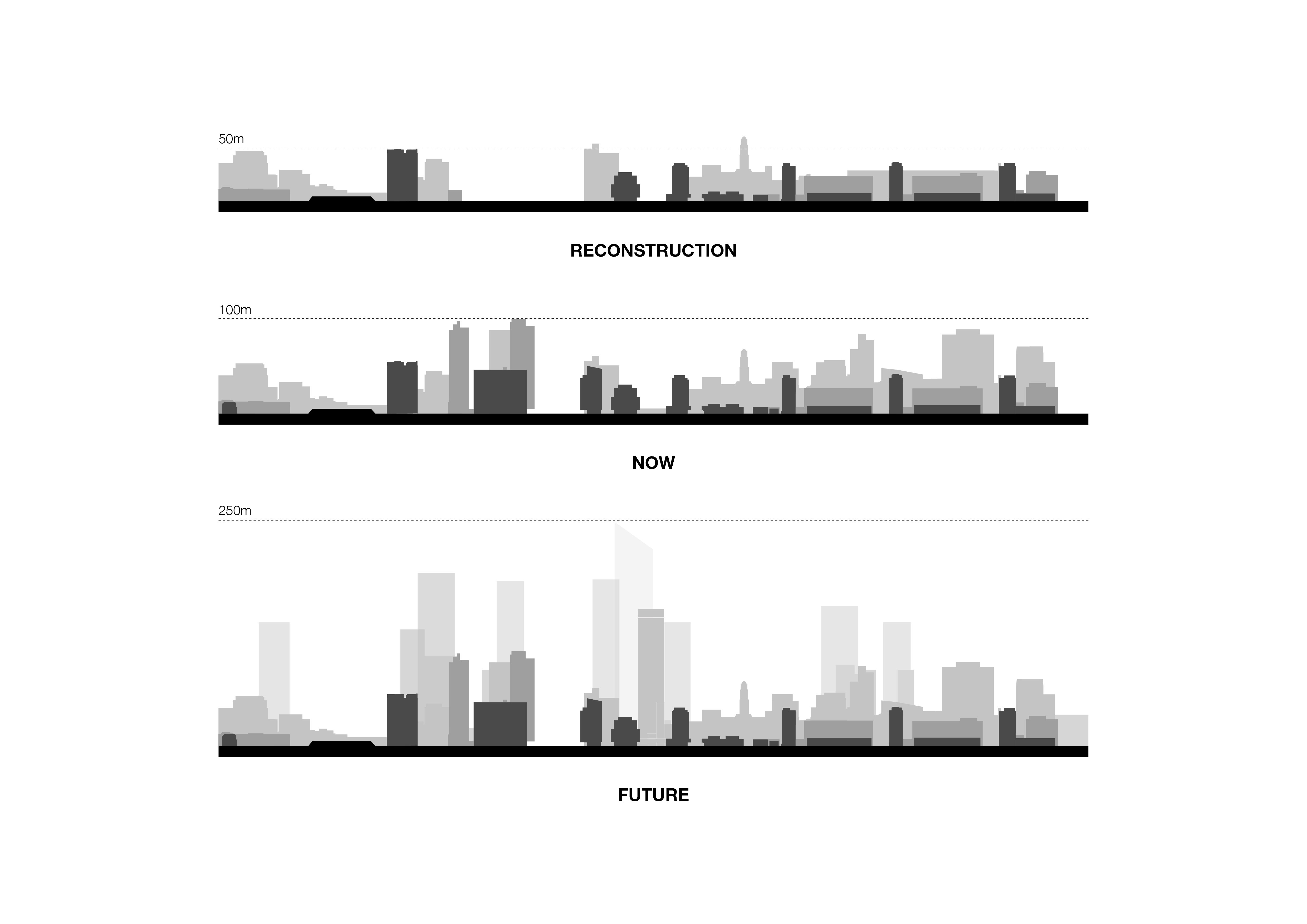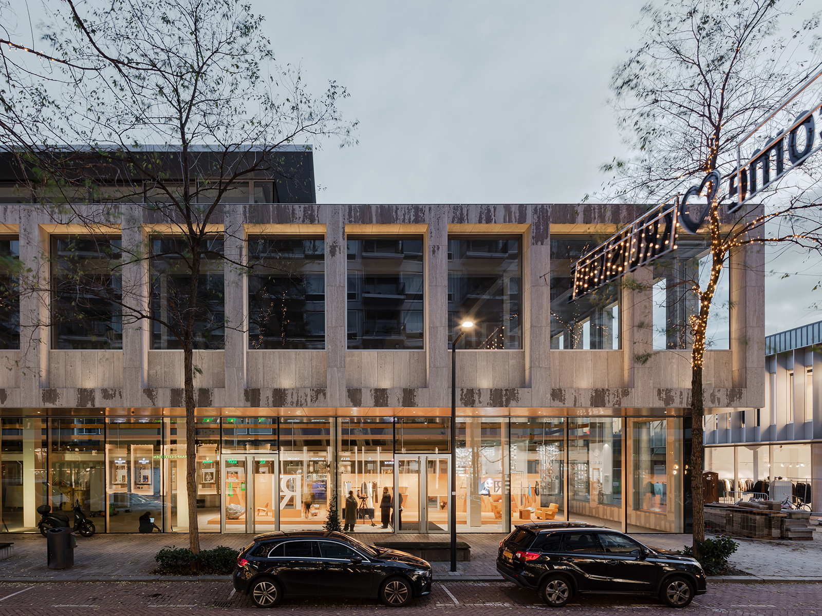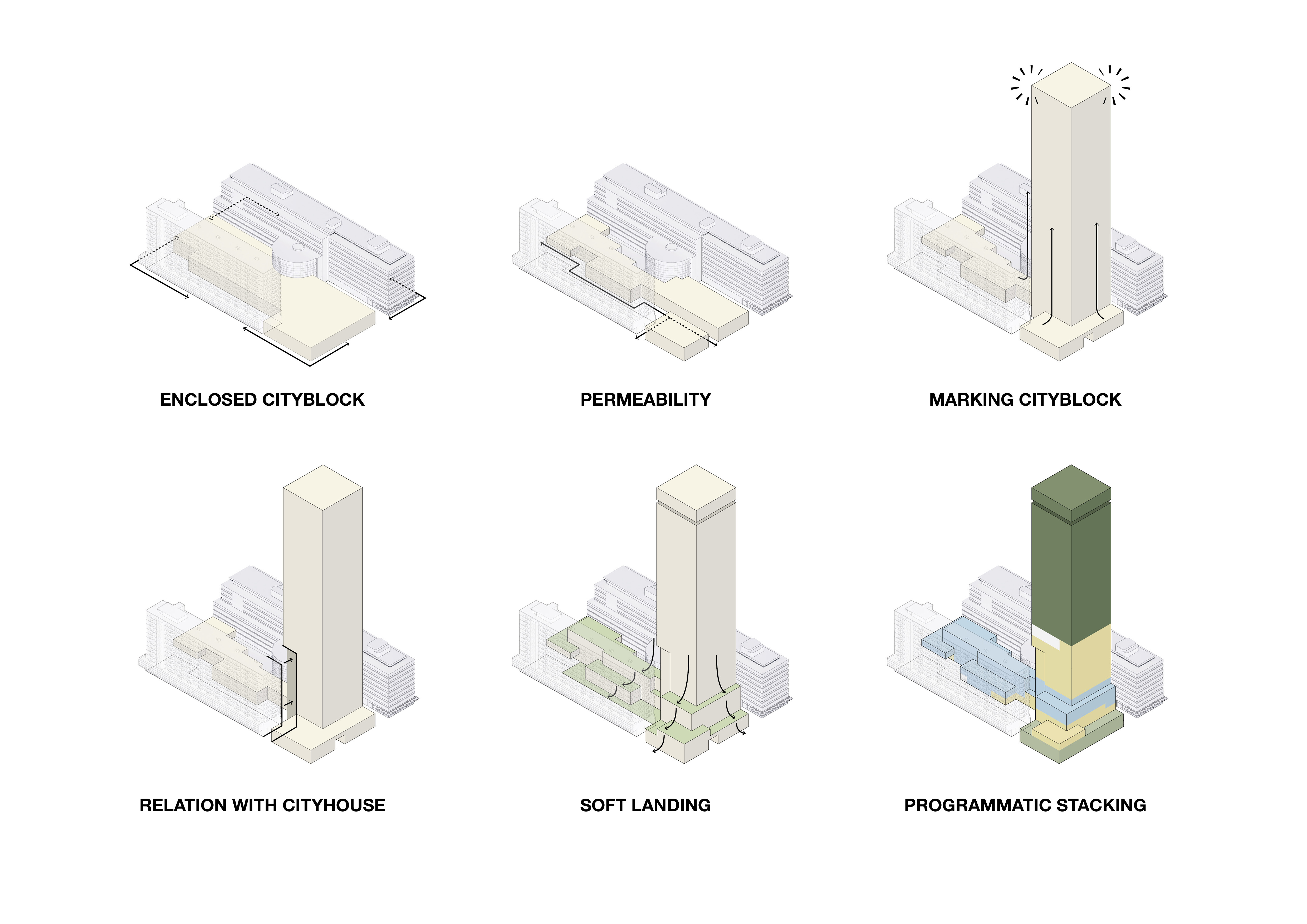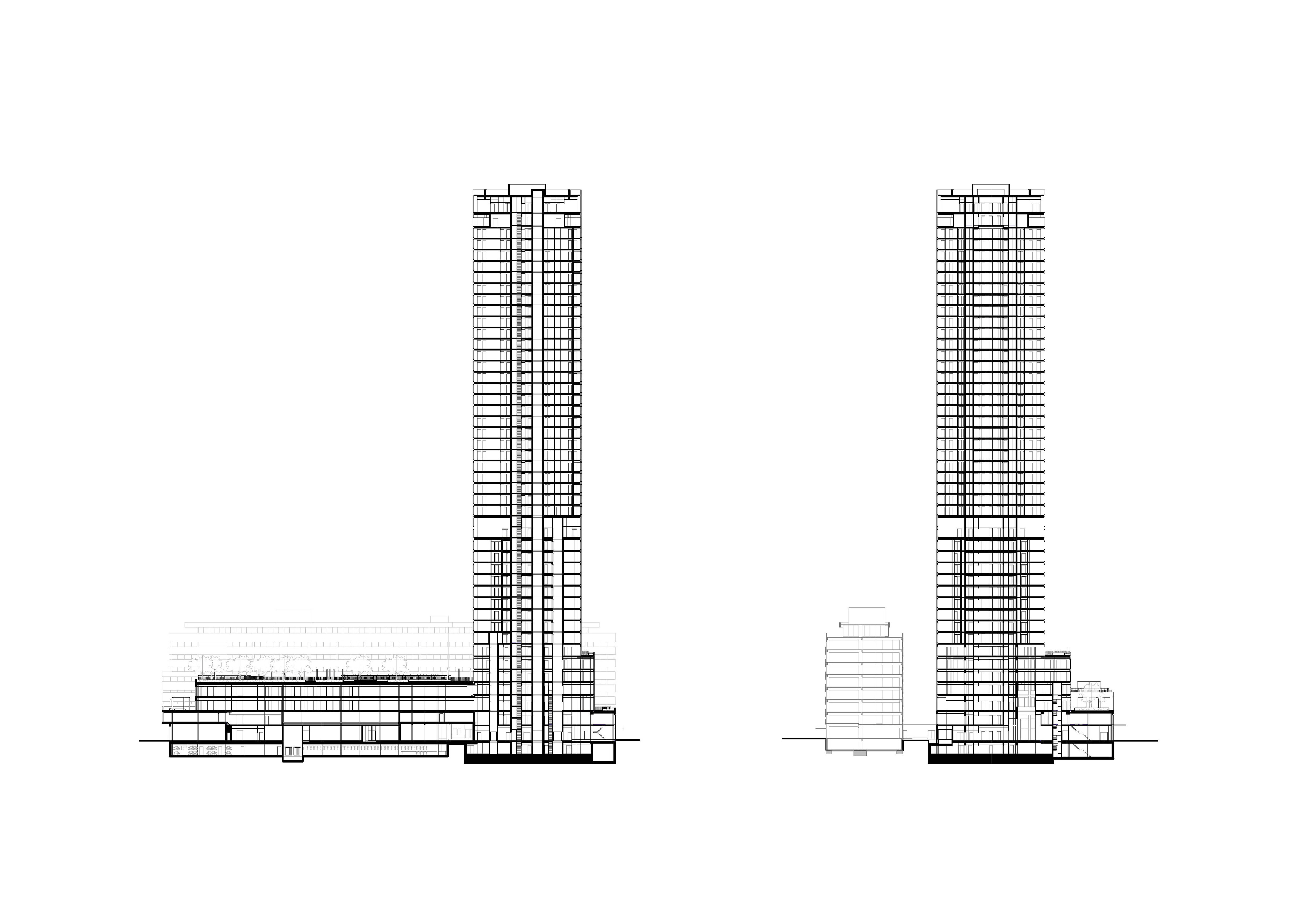 Lumière is an ambitious plan for a 155m tower with a publicly connected and locally integrated plinth. Positioned between the Lijnbaan, Kruiskade, and Karel Doormanstraat, the plinth spreads out to connect with its surroundings, becoming a semi-public city block while keeping the monumental buildings of the Lijnbaan ensemble intact. After slight setbacks in the volume, the tower rises from the base. The sleek natural stone facade increases in transparency towards the top and includes loggias for all apartments. A majestic crown contains penthouses and shared spaces for residents, such as a common living room and winter garden.