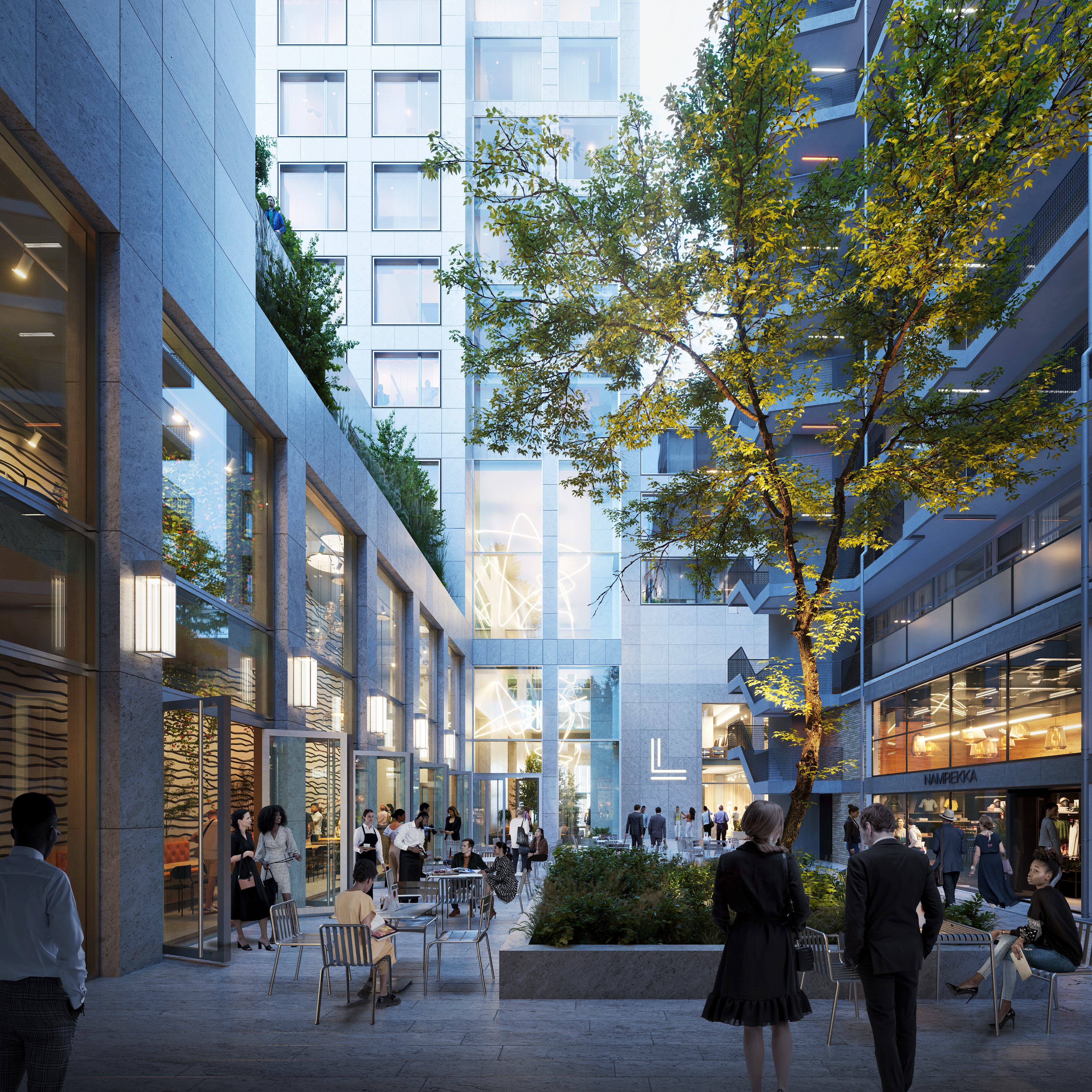 Lumière provides a qualitative impulse by combining 263 apartments, a hotel with 160 rooms, shopping, working, and recreation into one mixed-use project. Commercial functions and facilities occupy the ground floor, along with a large atrium at the foot of the tower leading to entrances of the hotel, offices, and apartments. The project transforms the current Lijnbaanhof into an intimate yet lively passage with workspaces, a cafeteria, and other amenities. Green accessible terraces with seating areas and various nesting facilities run along the courtyard and up the tower via the setbacks, embedding the project in the natural environment of Rotterdam.