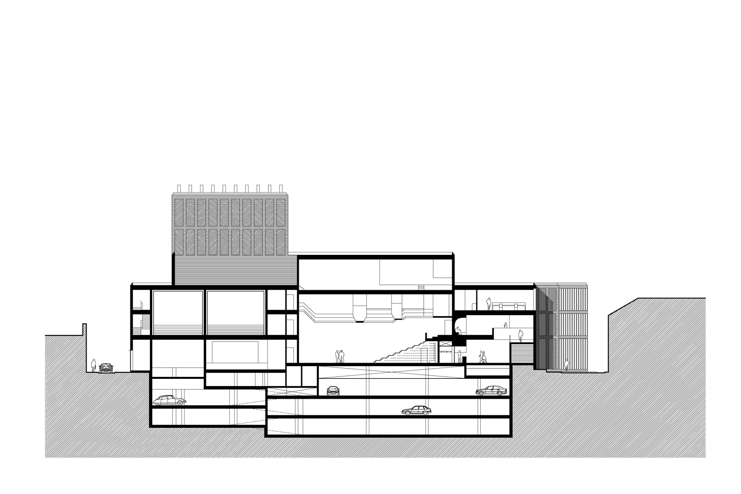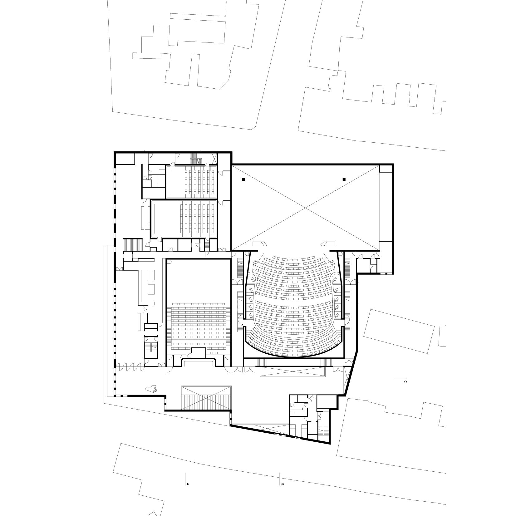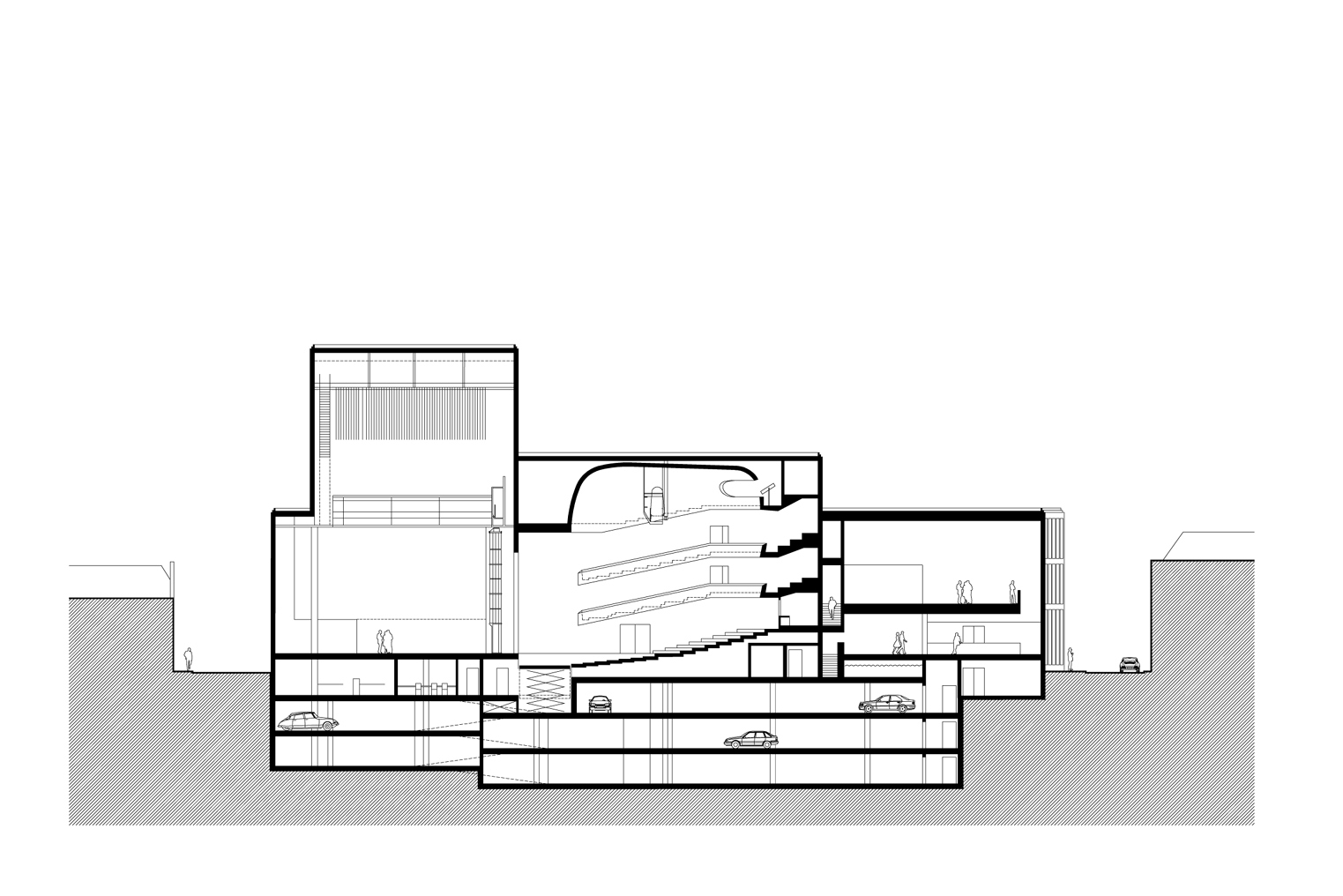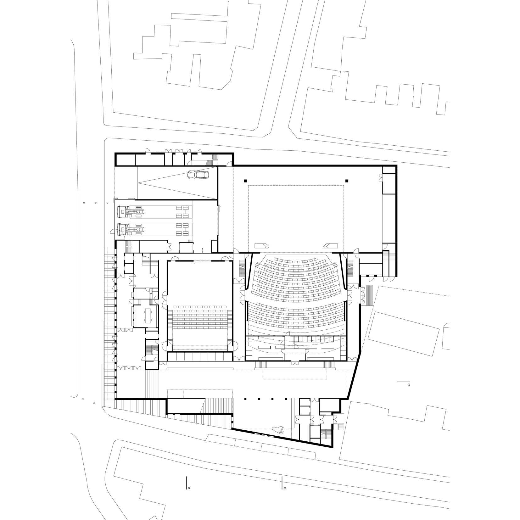 Within this clear volume, the programme is organised efficiently. The building accommodates a large and a small auditorium, a film theatre, foyers, a restaurant and a multi-purpose space. Technical areas, offices and delivery and loading facilities are integrated behind the scenes. Below ground level, within the 278-space car park, the changing rooms and foyer for performers are positioned alongside the orchestra pit of the large auditorium, allowing for direct and practical connections between stage and backstage areas.