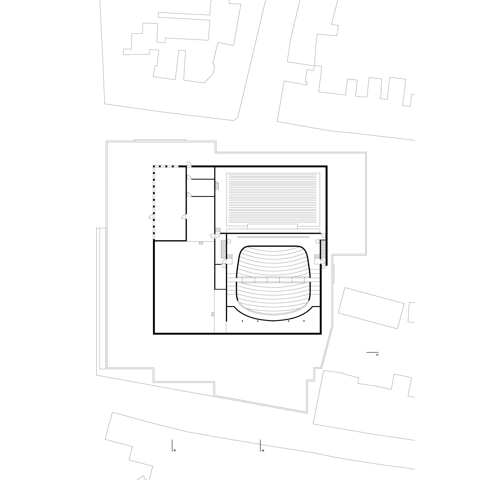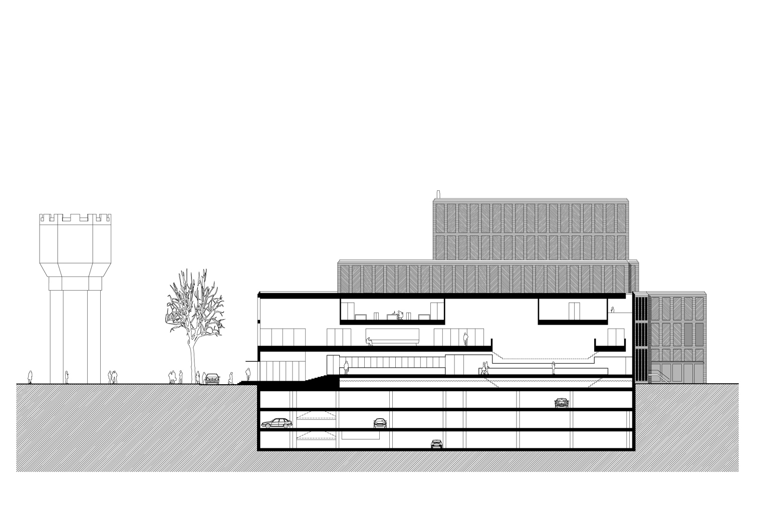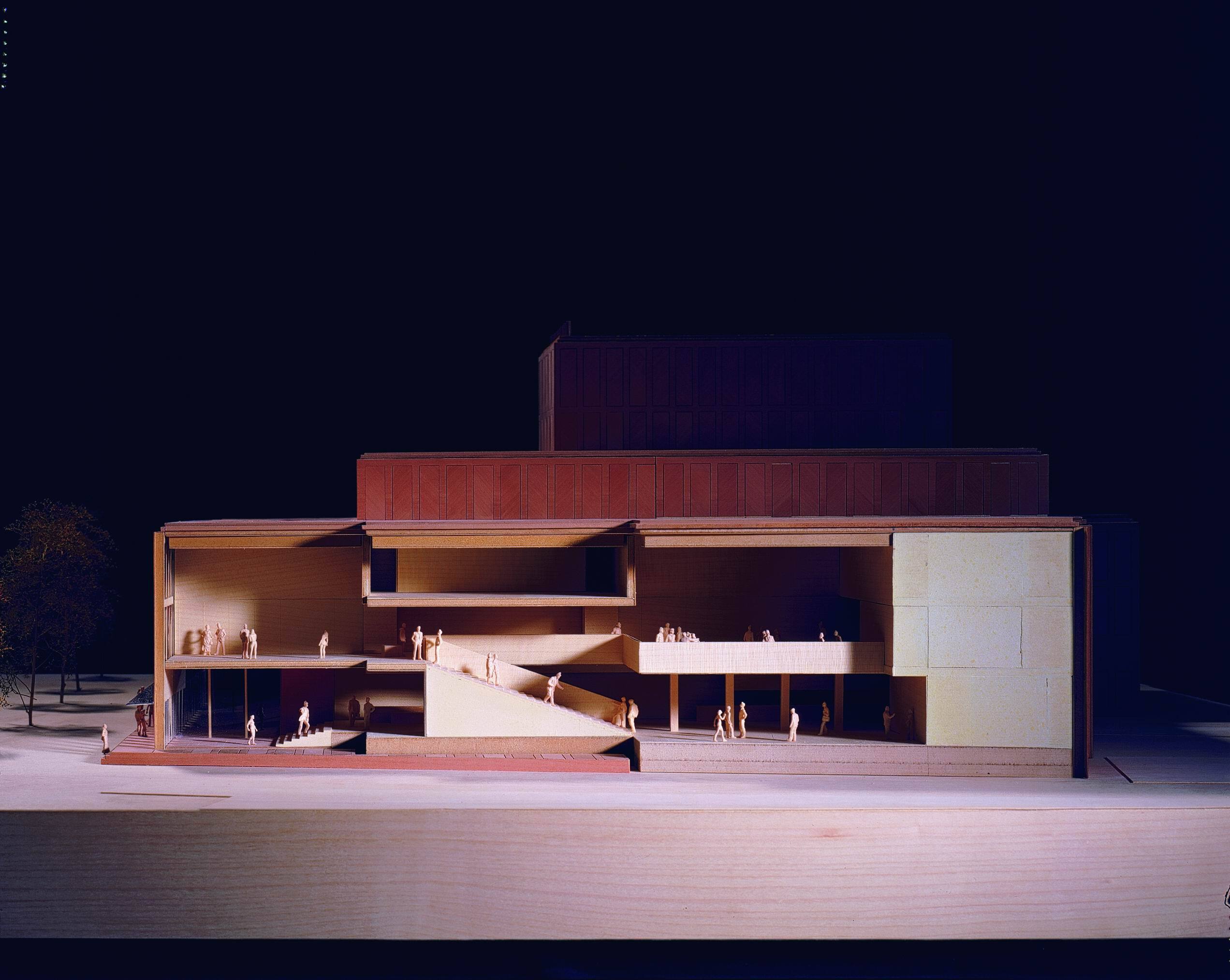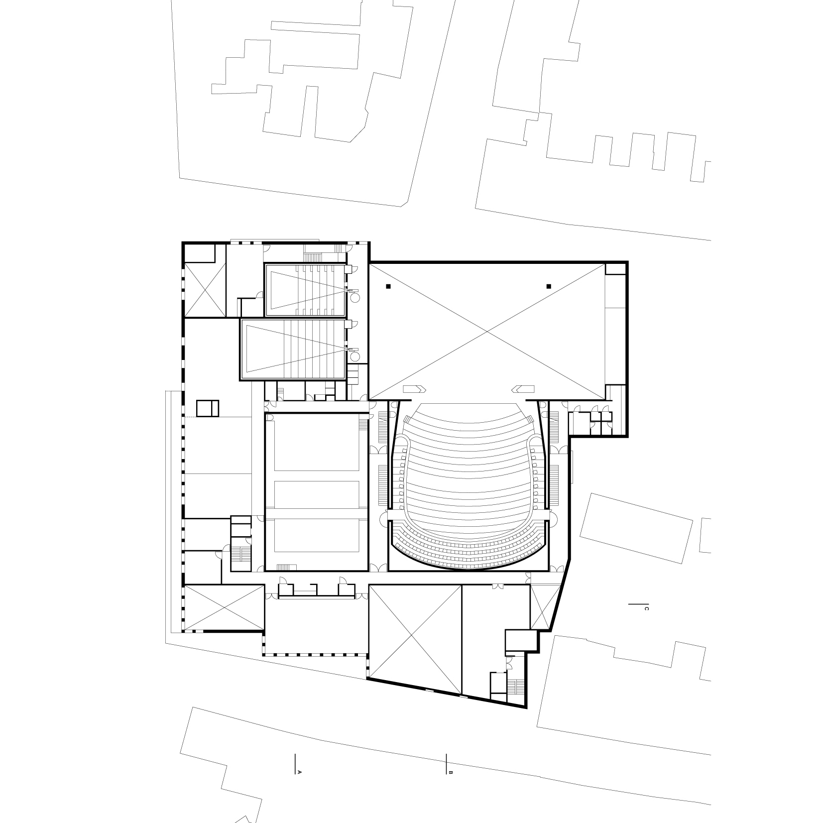 Within this clear volume, the programme is organised efficiently. The building accommodates a large and a small auditorium, a film theatre, foyers, a restaurant and a multi-purpose space. Technical areas, offices and delivery and loading facilities are integrated behind the scenes. Below ground level, within the 278-space car park, the changing rooms and foyer for performers are positioned alongside the orchestra pit of the large auditorium, allowing for direct and practical connections between stage and backstage areas.