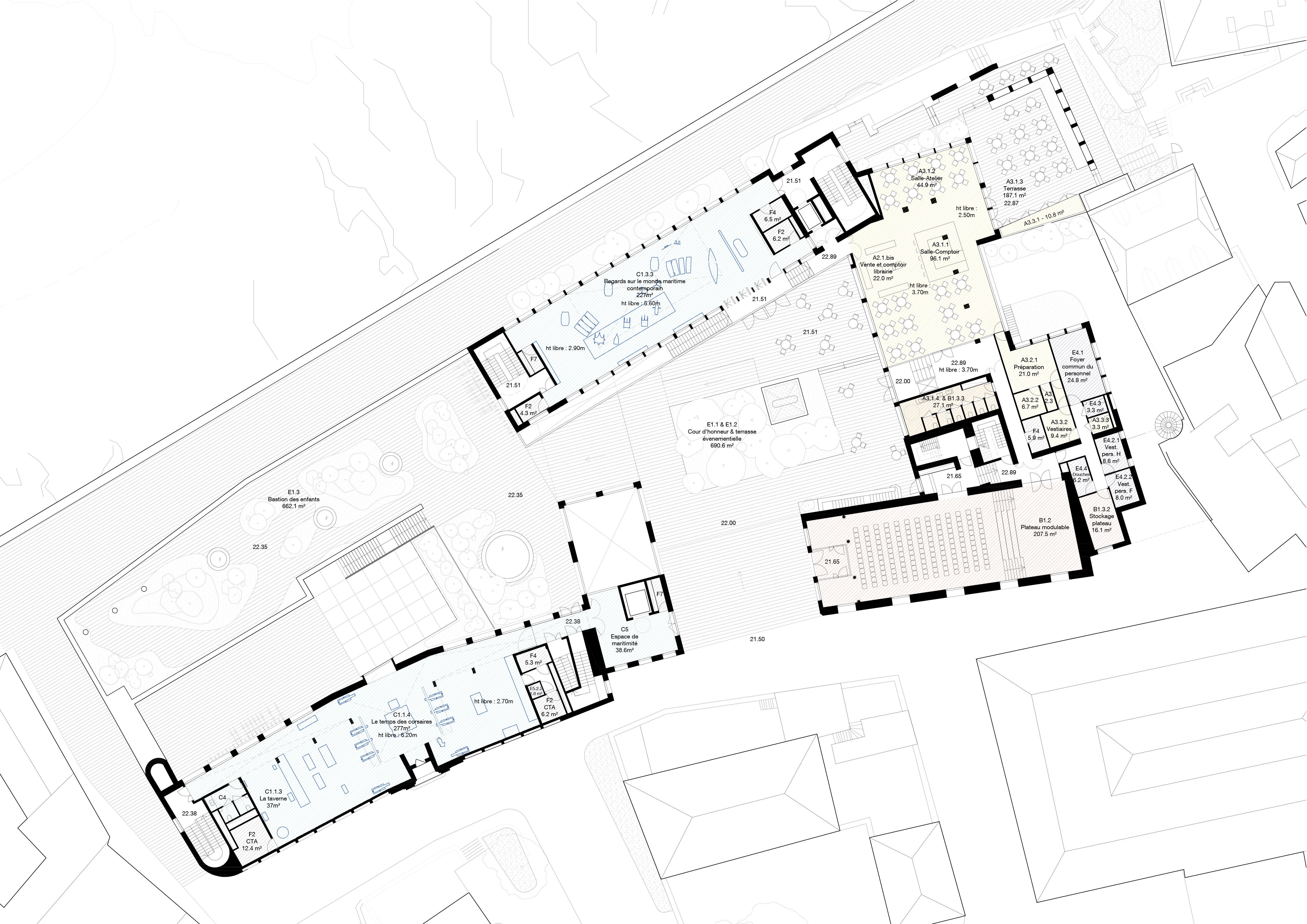 A continuous path guides visitors from the ramparts to a generous entrance, inviting them into an immersive journey through the city’s maritime heritage. The layout is designed to enhance accessibility and flow, ensuring a clear and engaging experience. At its highest point, an elevated platform provides a new vantage point over the bay, offering shifting perspectives of the tides and the horizon—reinforcing Saint-Malo’s deep-rooted connection to seafaring and exploration.