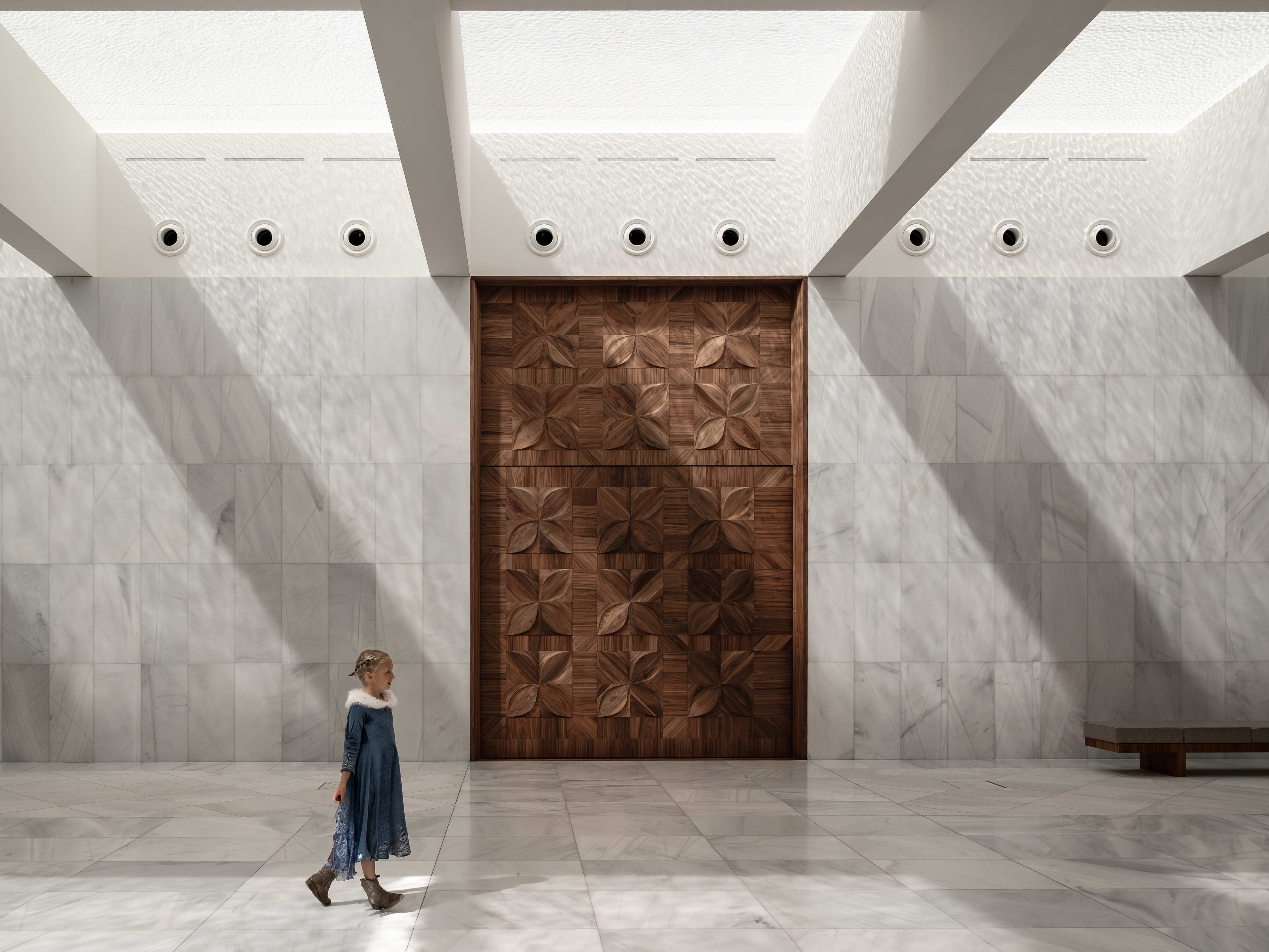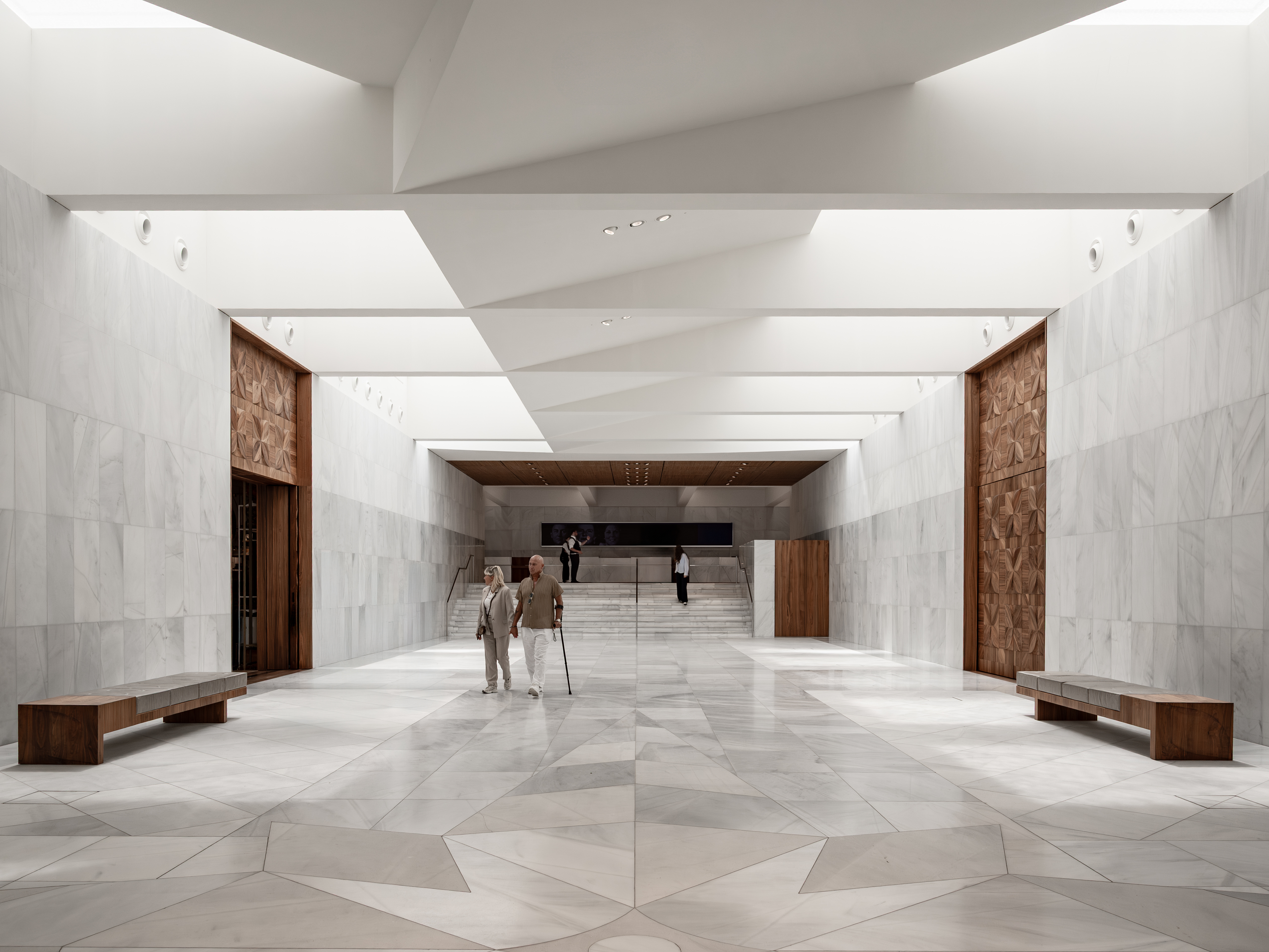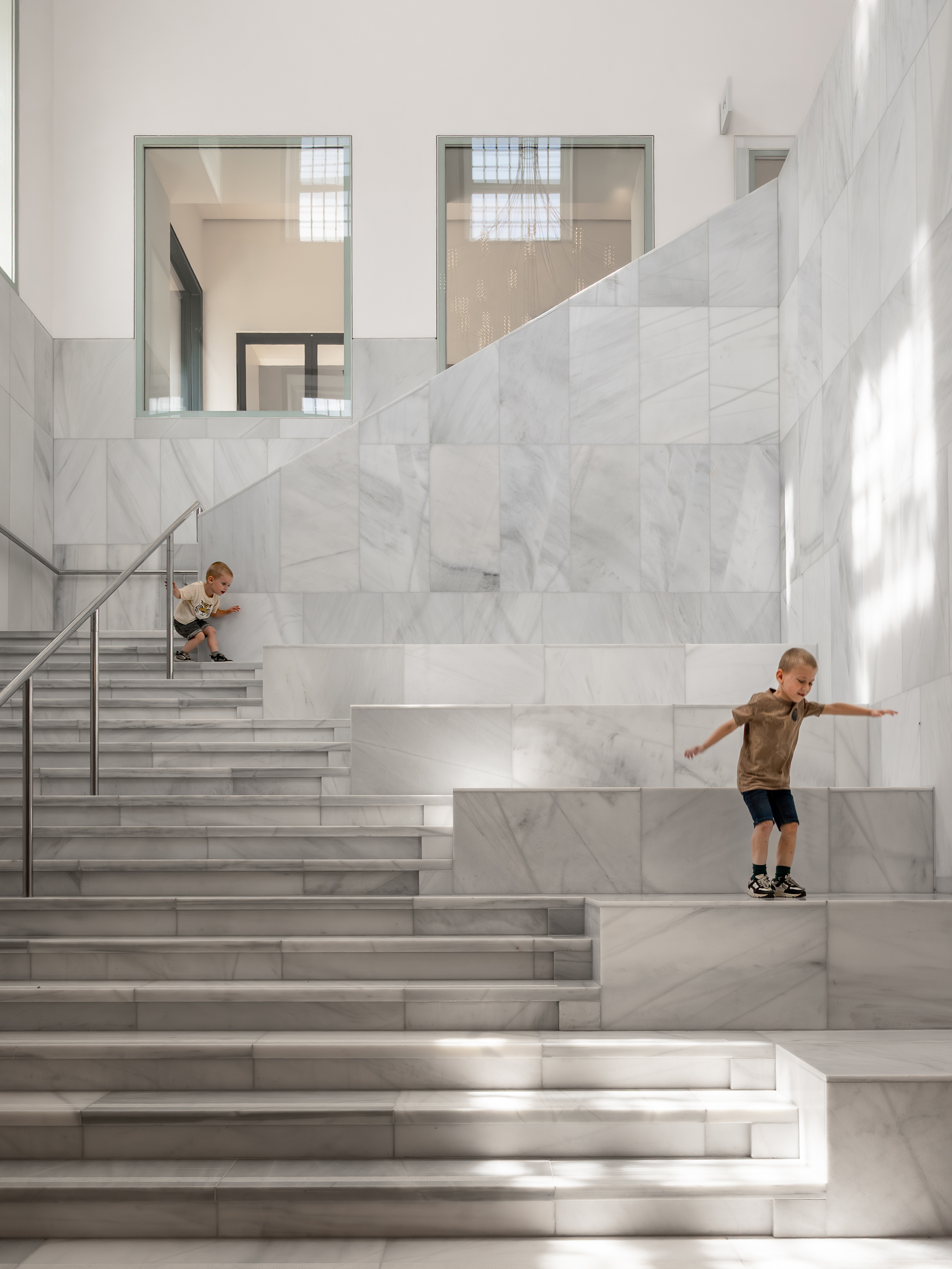 Located at the ends of the palace wings, entry pavilions lead visitors down to the light-filled balcony and into the Grand Foyer, which serves as the central hub of the extension. The Grand Foyer maintains the symmetry of the baroque composition and a large wind rose in the floor indicates the center of the extension, offering visitors different directions to explore. The extension features exhibition halls, a museum for children, and a permanent exhibition on the history of the Dutch royal family. As part of the intervention, the historic building underwent careful restoration to improve technology and climate control systems, and a new staircase provides panoramic views of the grounds. The finishes in the new building are elegant and restrained, with textures and materials blending harmoniously. Walnut wood, marble with alternating sandblasted, honed, and polished surfaces, and opulent fabrics with metallic threads are used throughout, referencing the gardens and the ornate halls of the original palace.