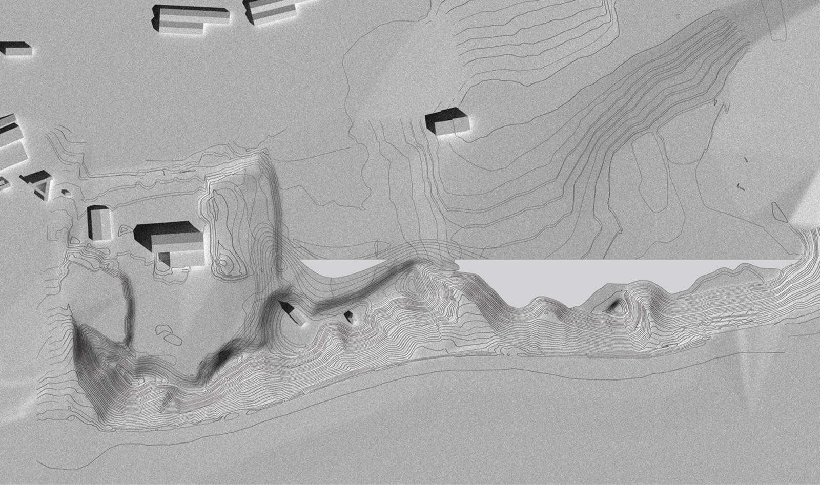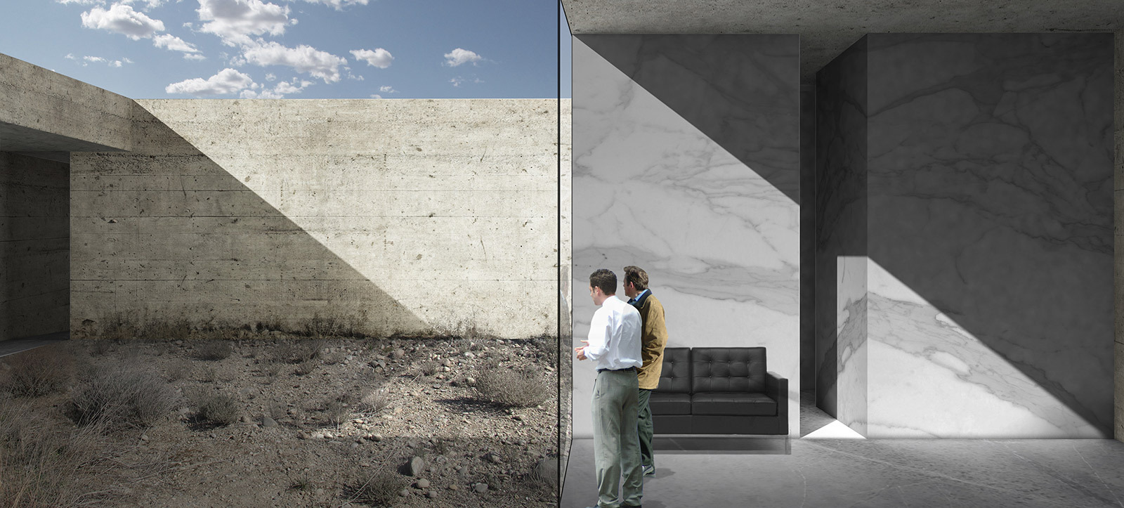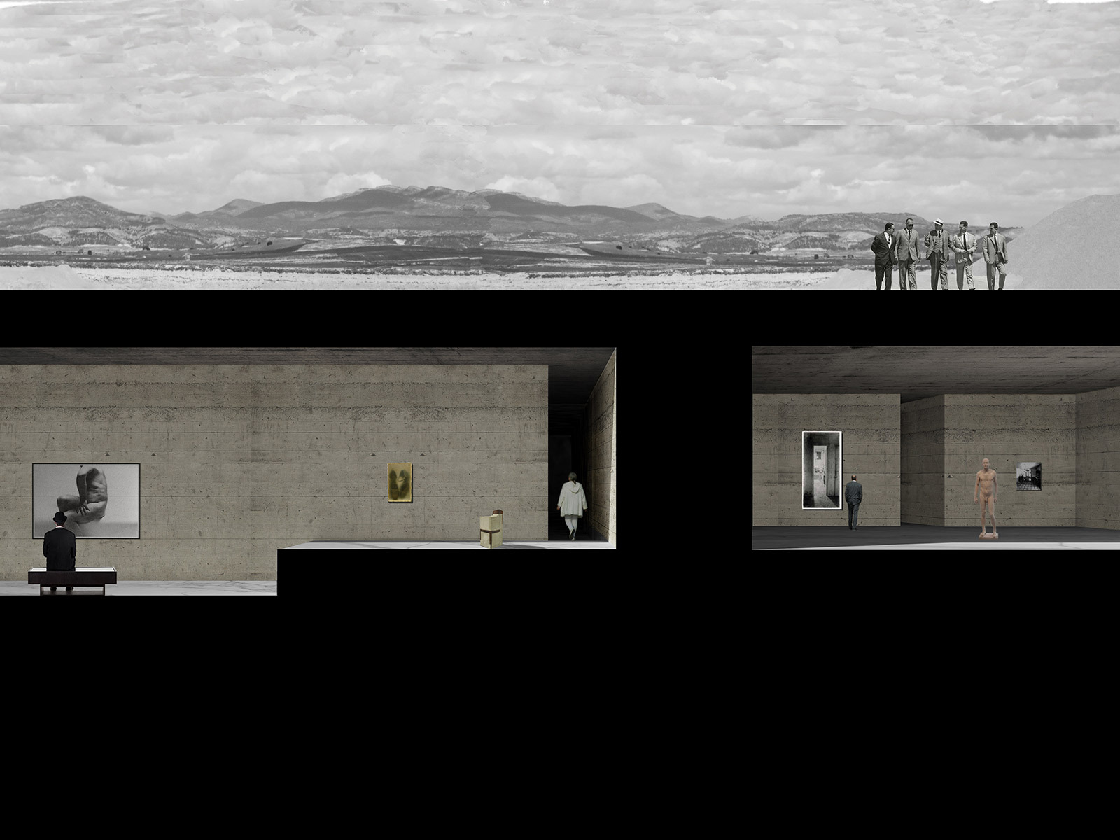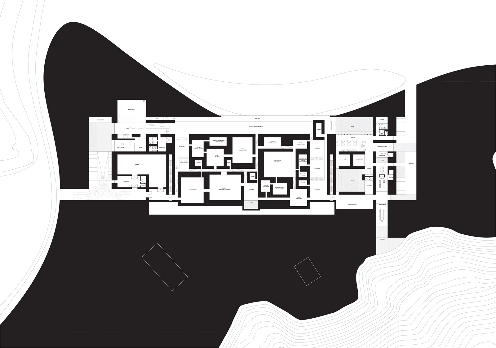 There are three areas: visitor entrance and warehouse, collection hall, and staff entrance. All are connected by multiple circulation routes. The collection space is subdivided into three blocks with specific themes, and black and grey rooms are ‘excavated’ from the volume of the platform to create Curiosity Rooms. These spontaneous openings cut through the main outer wall to interact with the broader landscape. The thickness of the walls transforms a simple wall into a room and the visit into a physical experience.