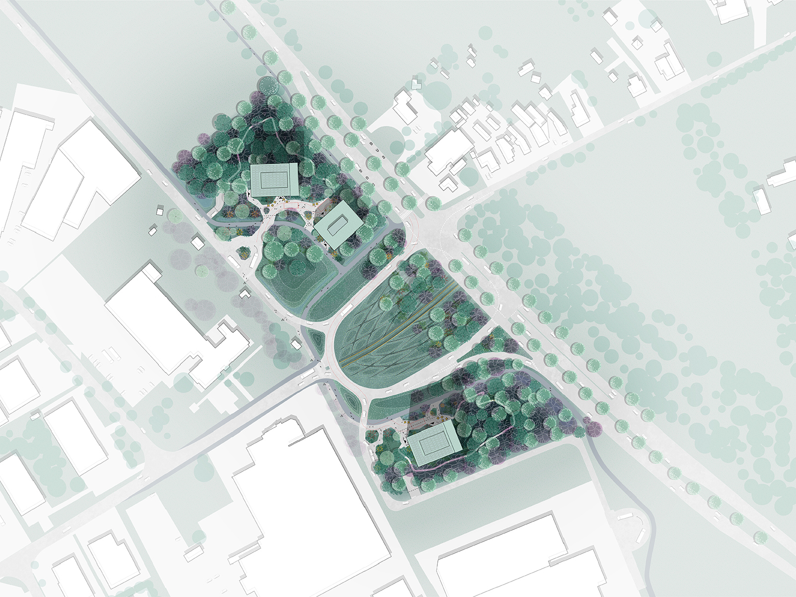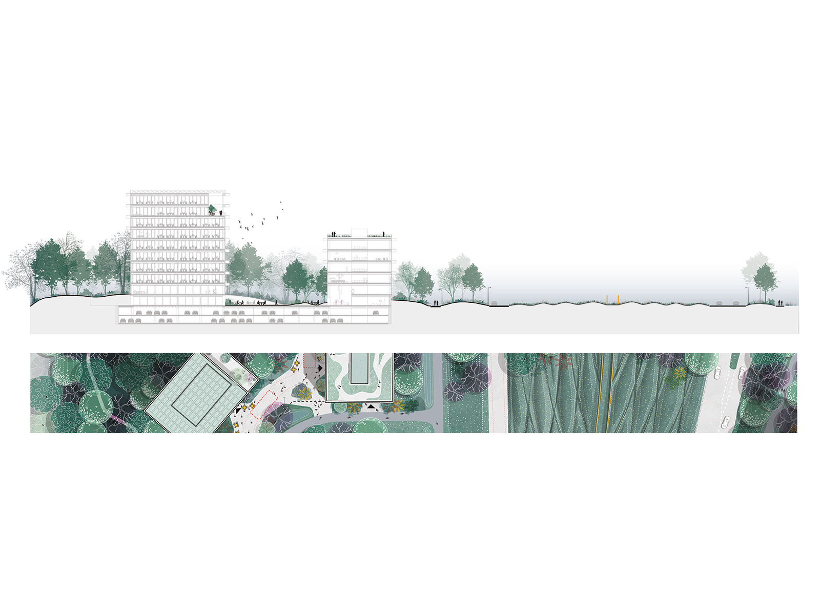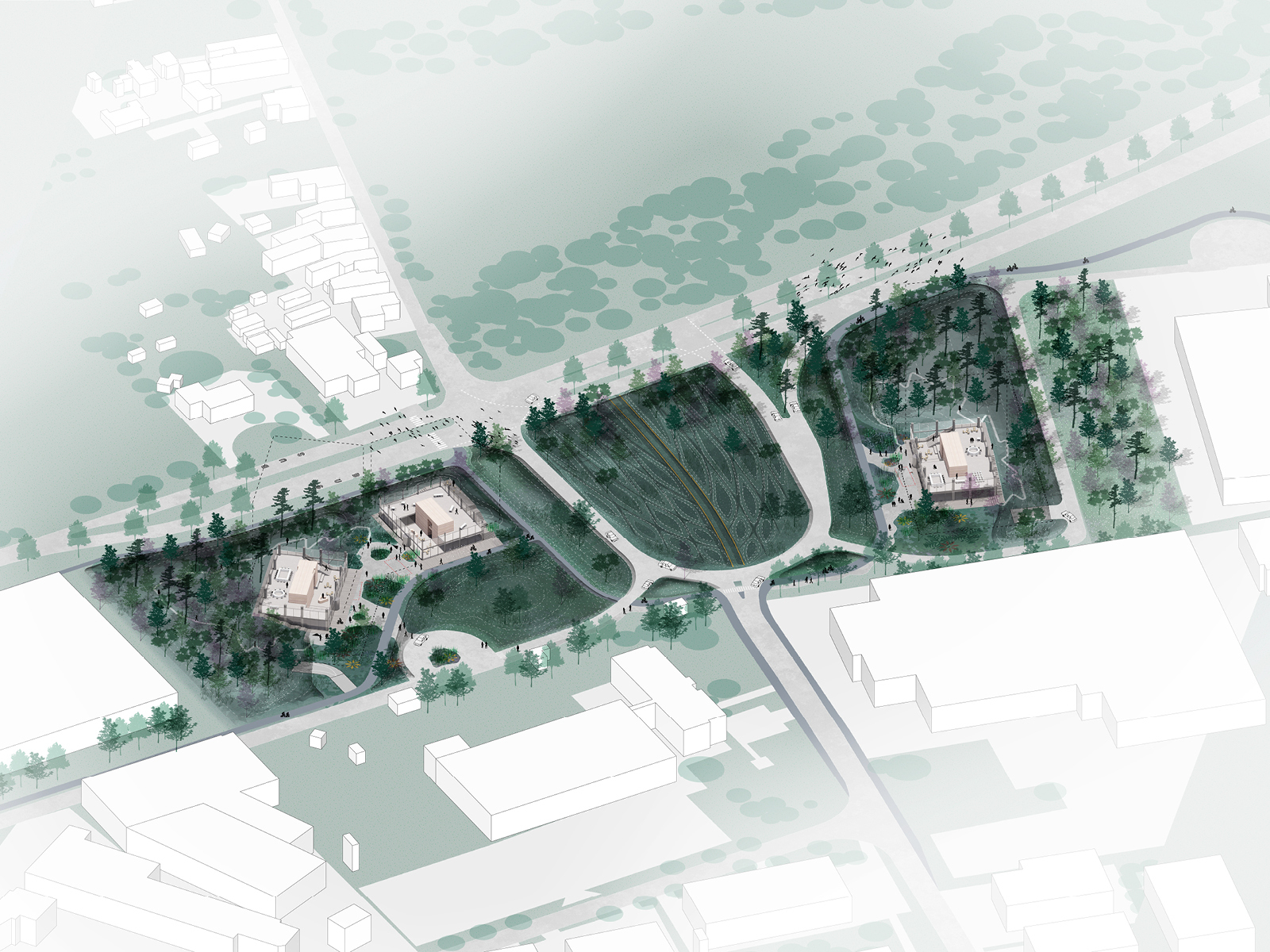 Situated near Ghent, the De Prijkels business park is home to over 60 thriving businesses and continues to expand. The Poort van de Prijkels project aims to create a distinctive entrance for this flourishing estate by transforming an anonymous intersection into a welcoming zone. The new buildings cater to the needs of businesses on the estate, offering various office facilities and employee amenities such as child daycare, a bank, a fitness centre, and other commercial services.