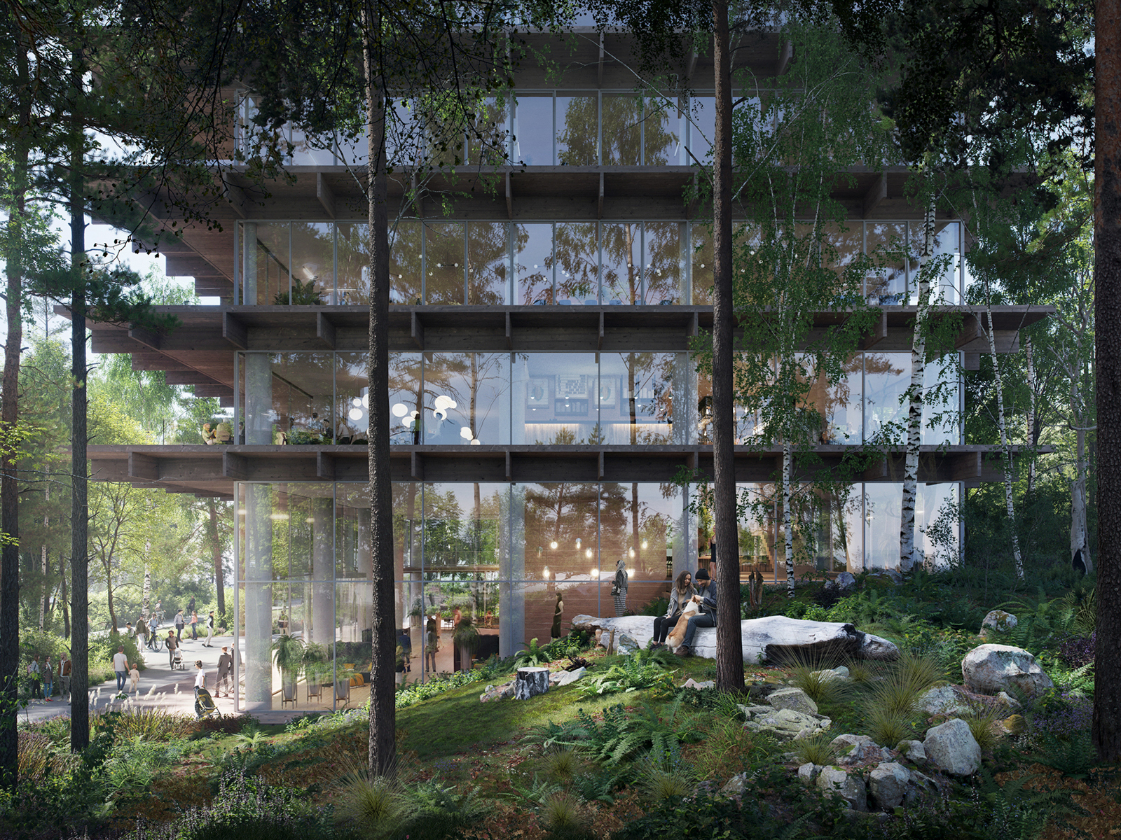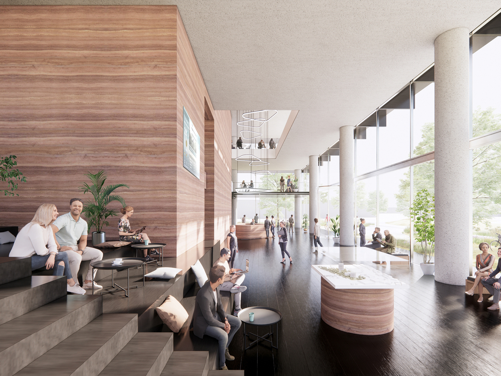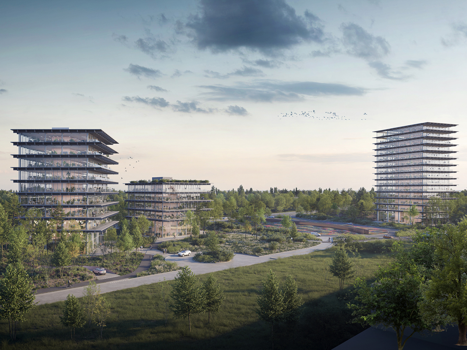 The master plan for the Poort project places great emphasis on integrating with the surrounding landscape. The three buildings are nestled in the green landscape and converge around a captivating land art installation, Het Karrenspoor by Paul de Kort. The lush landscape serves as a natural carbon sink. The Poort ensemble stands out with its predominantly transparent design of floor-to-ceiling glass facades and wooden galleries. The dark-stained oak cantilevers extend further on the sun-facing sides, serving as both terraces and structural sun protection. Slender columns and central circulation cores ensure unobstructed views on all floors and allow for future adaptability. The ground floors feature spacious double-height halls that serve as meeting areas and entry points, fostering interaction among occupants through open sightlines and interconnected spaces. Each building incorporates underground parking facilities on two levels.