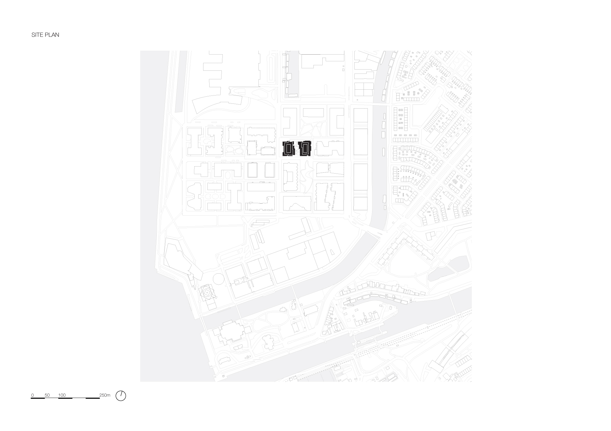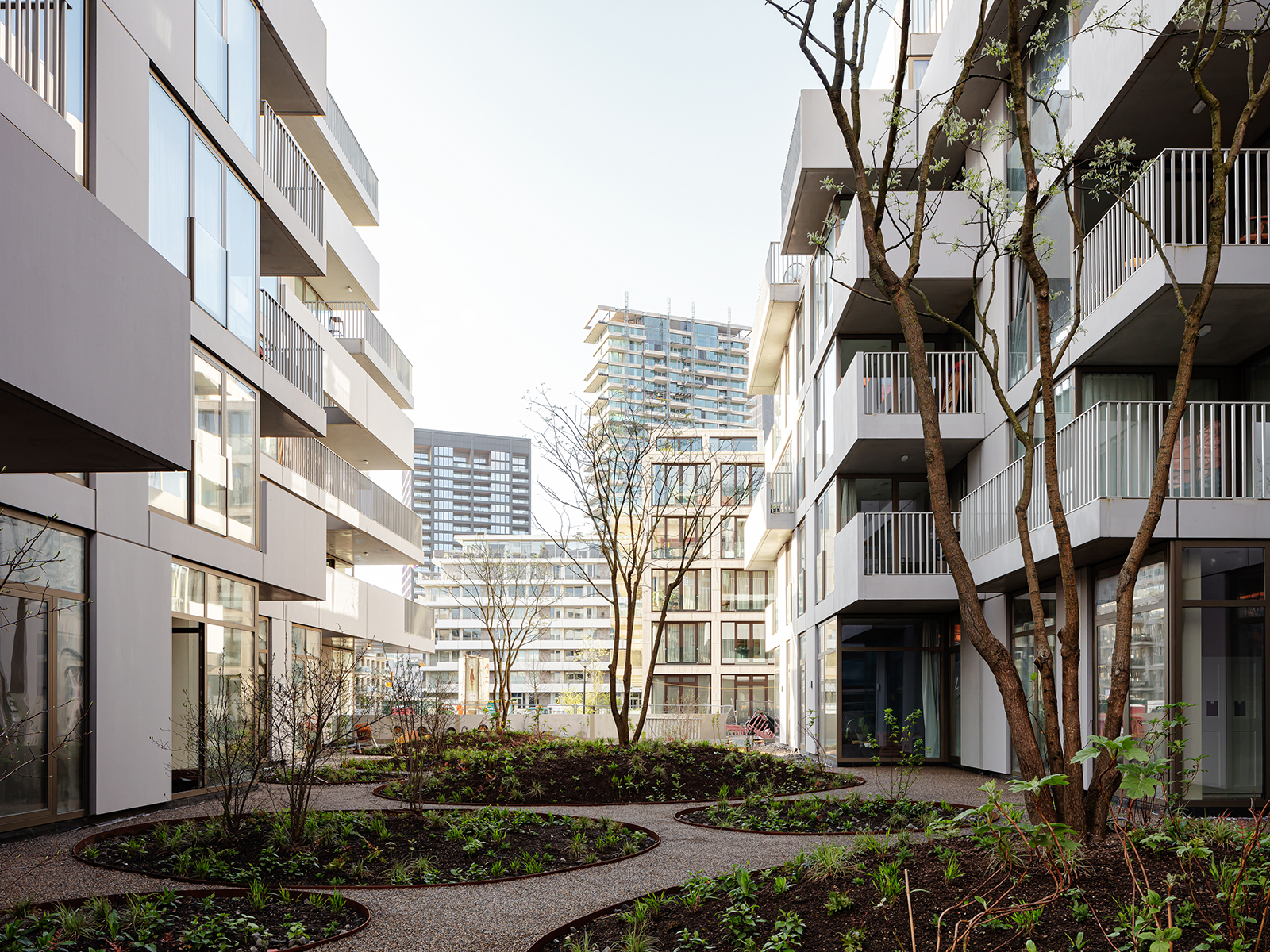For this specific location, the urban plan prescribed two smaller separated buildings with a communal garden in between. The eastern building, with seven floors, has its entrance along the Spadinalaan, and the western building has eight floors along the Sausolitolaan, giving both villas a clear address. The natural stone-clad entrances lead to the central core with clearly visible stairs. On the ground floor, the entrance also gives access to the communal garden situated in between more private terraces.