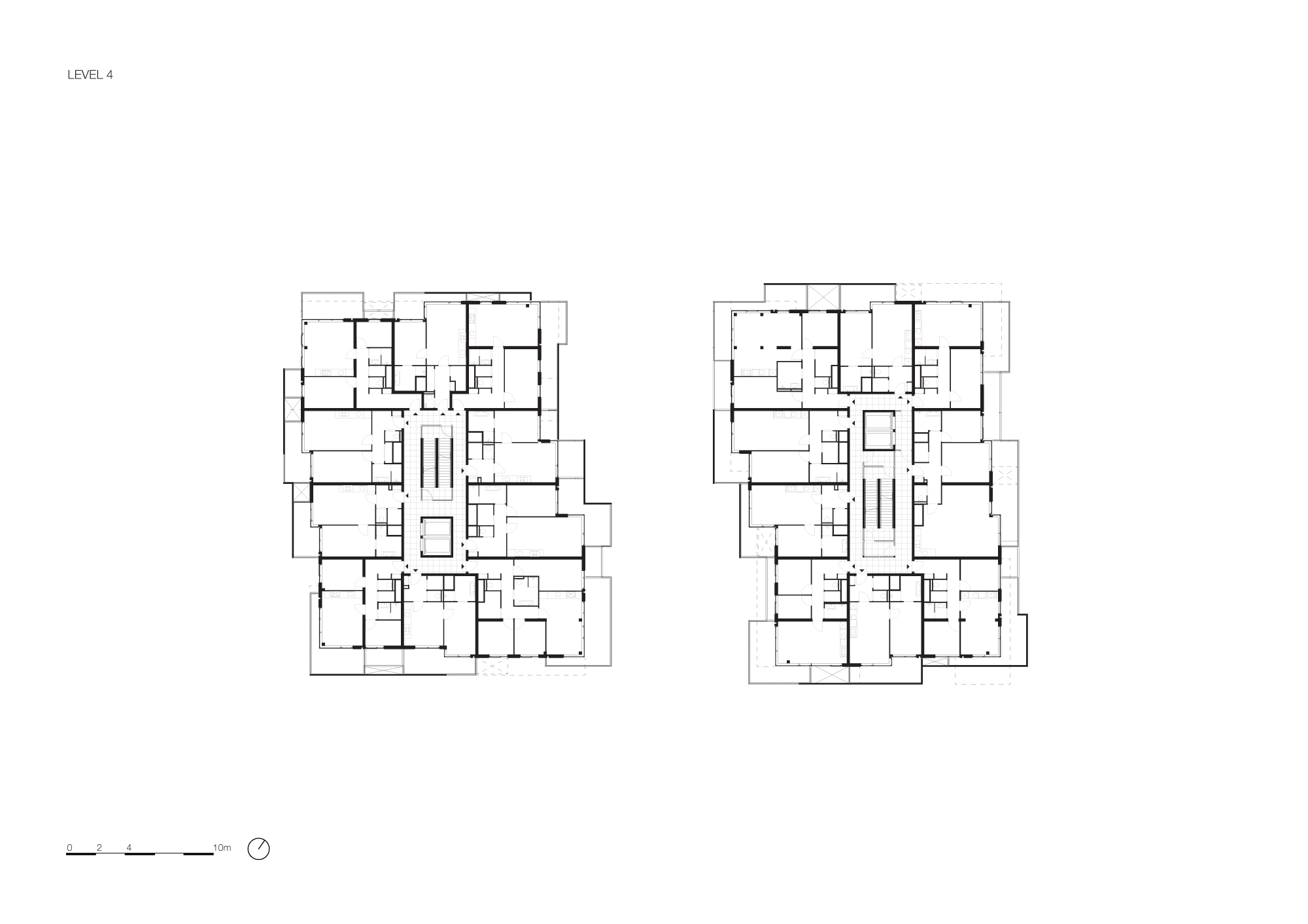 Although different, both blocks share a coherent visual identity. Light grey concrete is the unifying element for the façade panels, balcony slabs and balustrades. Using the same colour palette for the metal railings at the openings contributes to the continuity and sophistication of the complex.