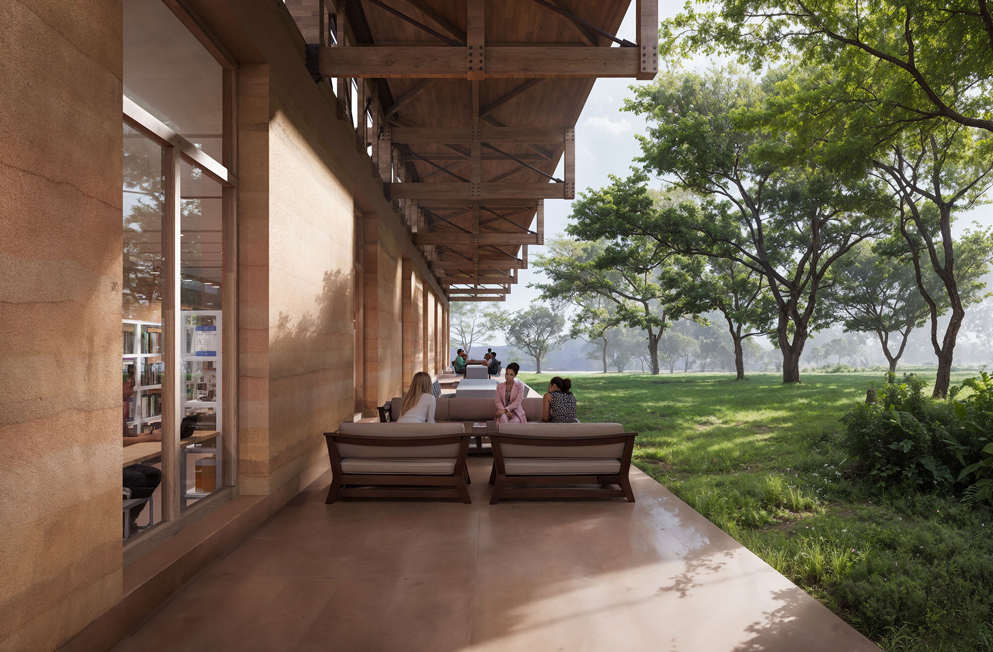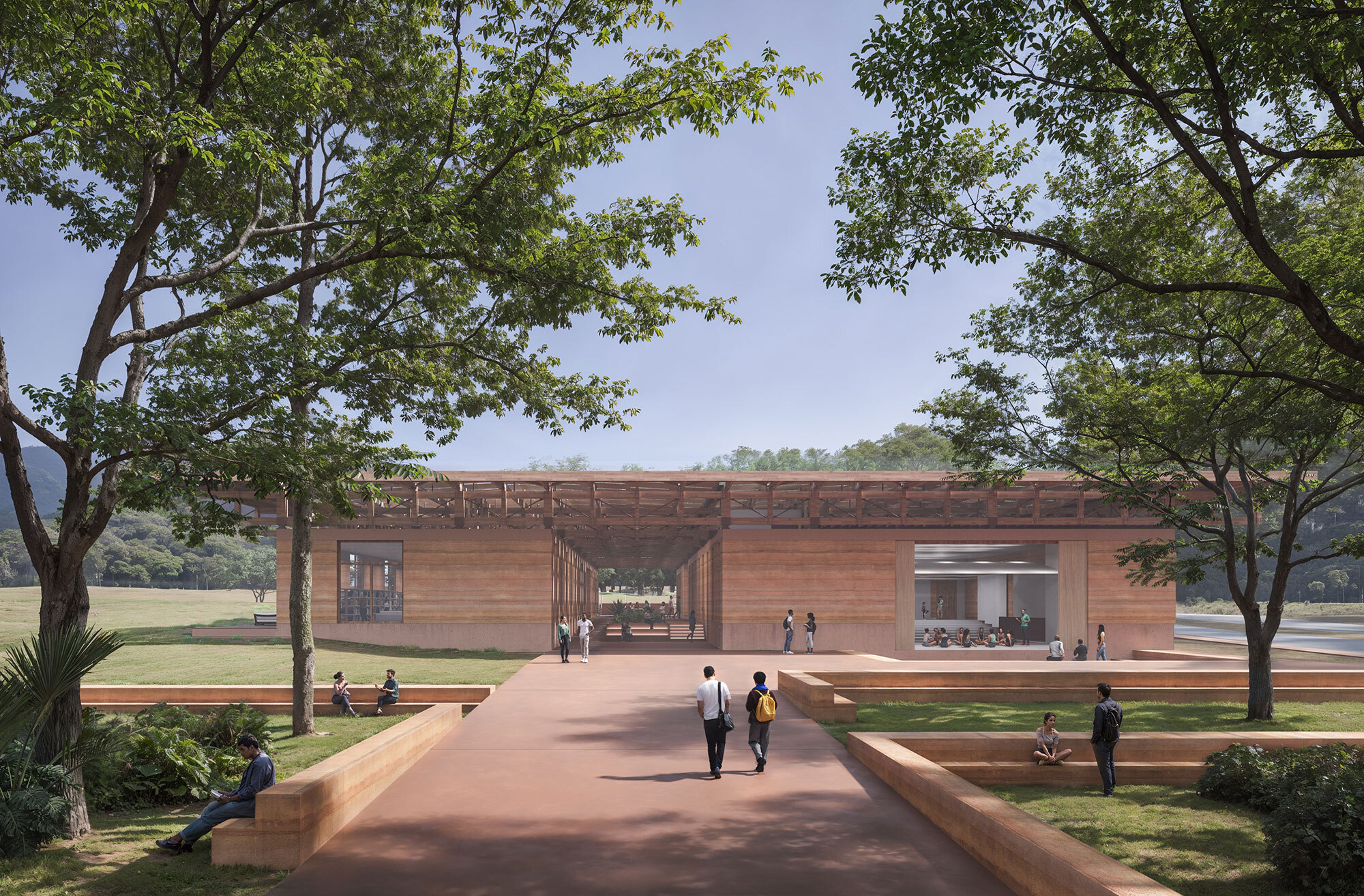 UFSCAR Library – Campus Lagoa do Sino in São Paulo, Brazil, serves as the new heart of the campus, bringing together a public plaza, library, auditorium, and the university’s administrative offices. Its design blends enclosed volumes with open-air spaces, encouraging social interaction and enriching campus life. A generous roof structure, detached from the building, creates a 1.5-meter air cushion and allows natural ventilation to maintain thermal comfort throughout the day. The building combines traditional rammed earth and timber, uniting time-honoured vernacular techniques with contemporary architectural solutions. Rammed earth—a millennia-old construction method—involves compacting layers of damp soil between wooden forms to create thick, stable walls with outstanding thermal and acoustic performance.
