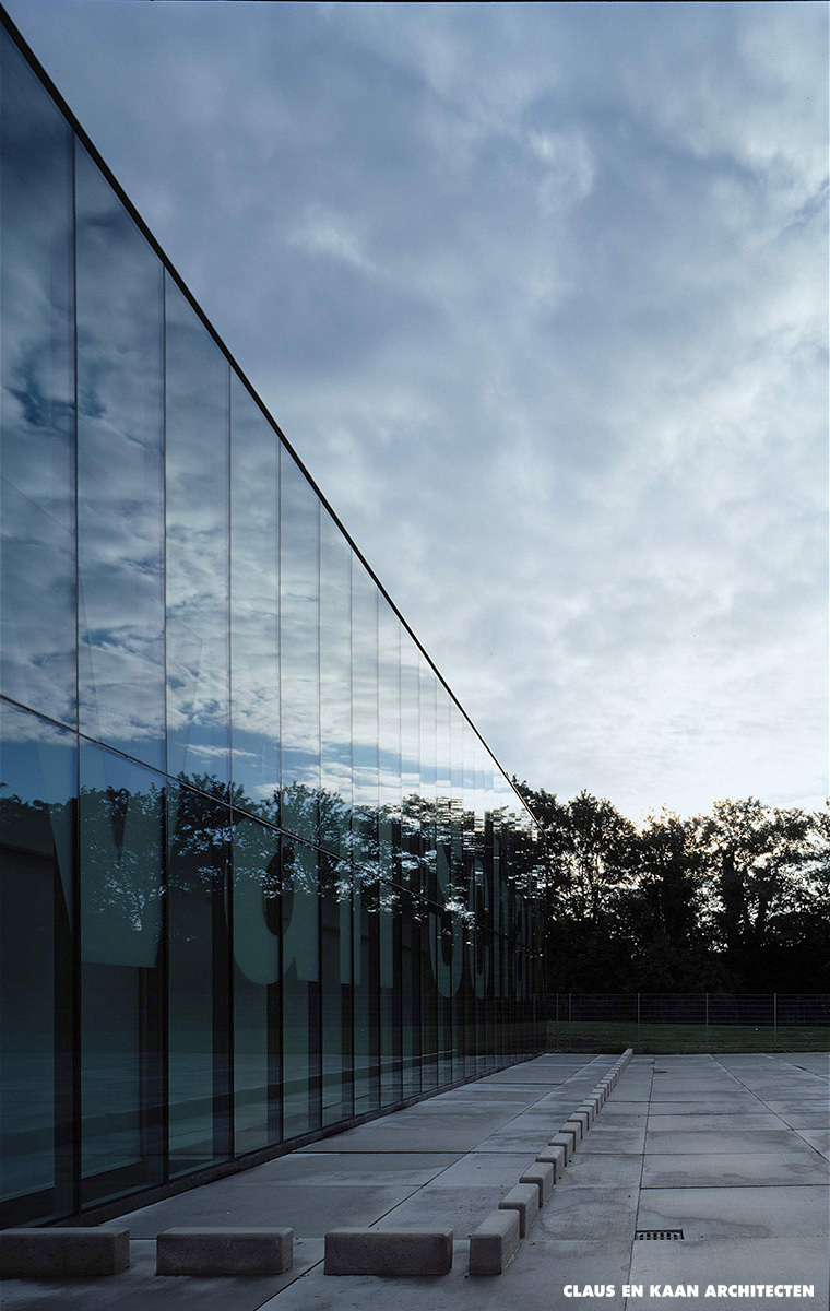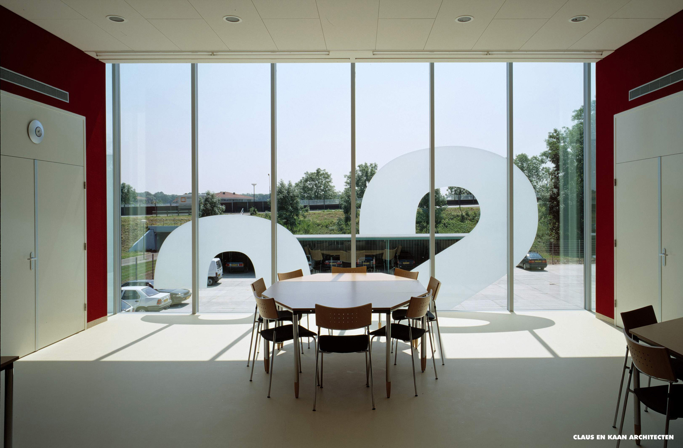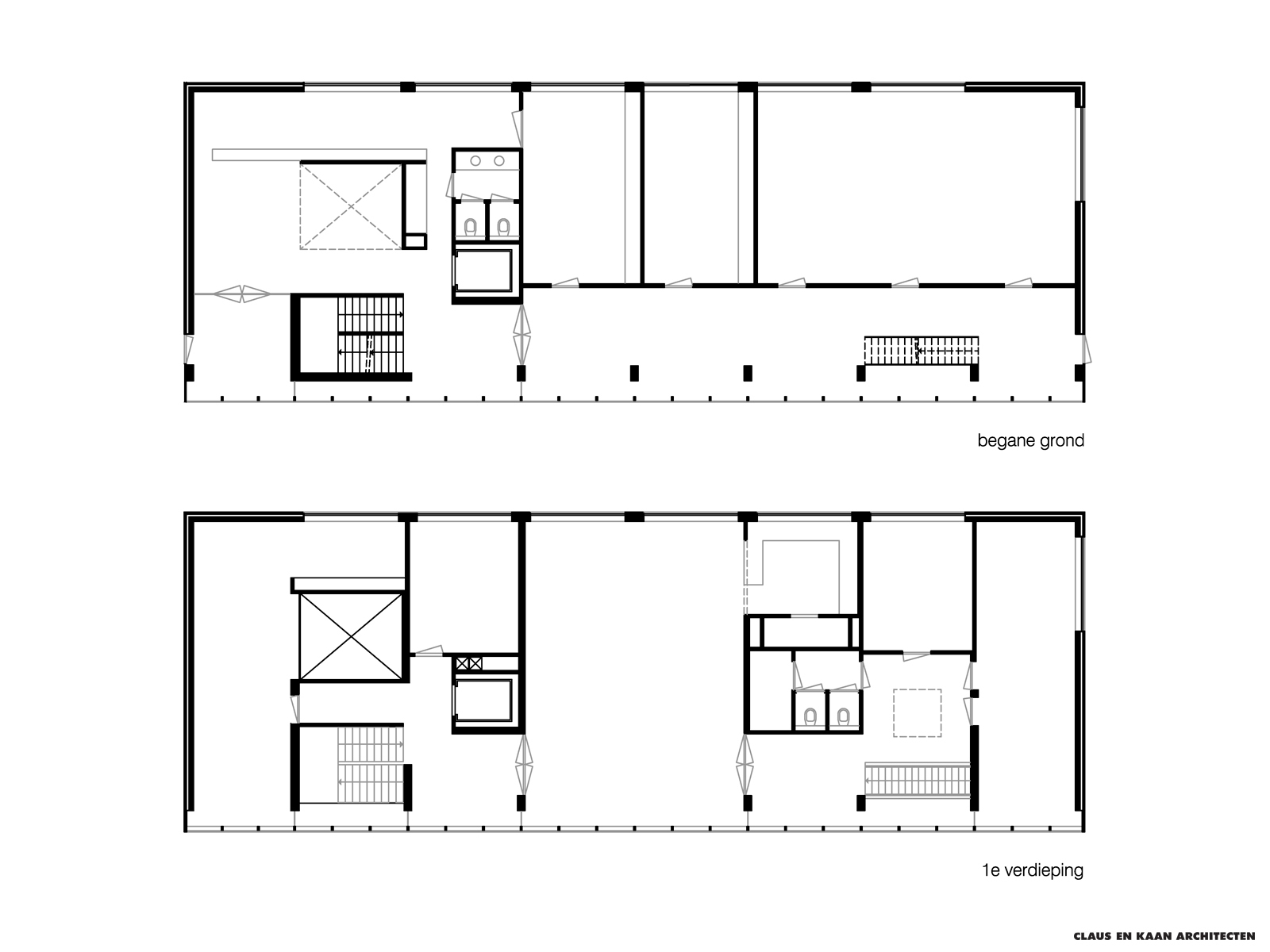 The Van Schaik Company Premises consists of two orthogonal volumes that turn their backs on a clutter of outlying sheds. One volume is for storage and the other is for offices. The latter has two facades: a closed one that faces onto the car park and a glazed south-facing façade that overlooks the work yard. Behind this glass screen is a double-height gallery that gives access to the offices.
