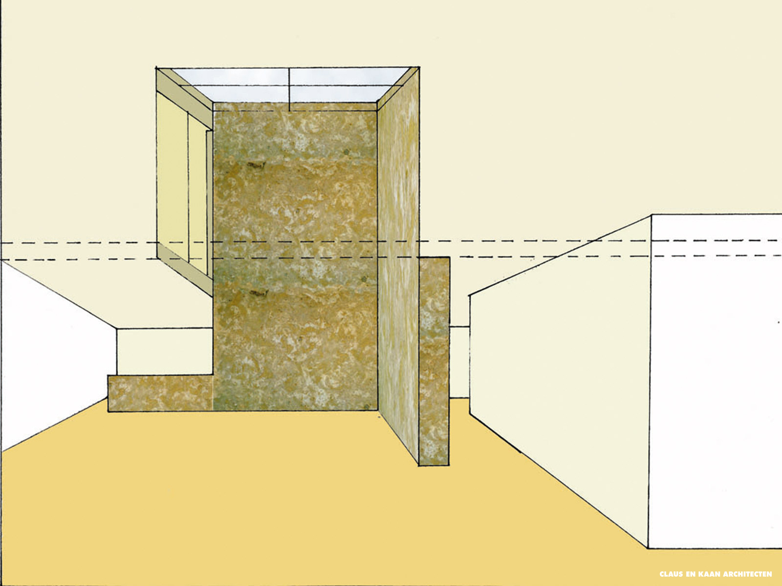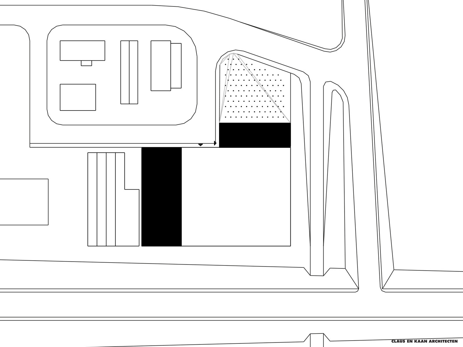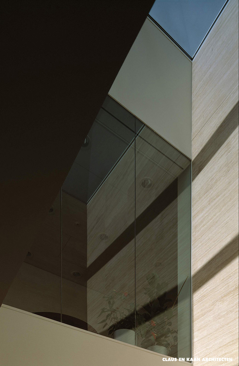 The Van Schaik Company Premises consists of two orthogonal volumes that turn their backs on a clutter of outlying sheds. One volume is for storage and the other is for offices. The latter has two facades: a closed one that faces onto the car park and a glazed south-facing façade that overlooks the work yard. Behind this glass screen is a double-height gallery that gives access to the offices.
